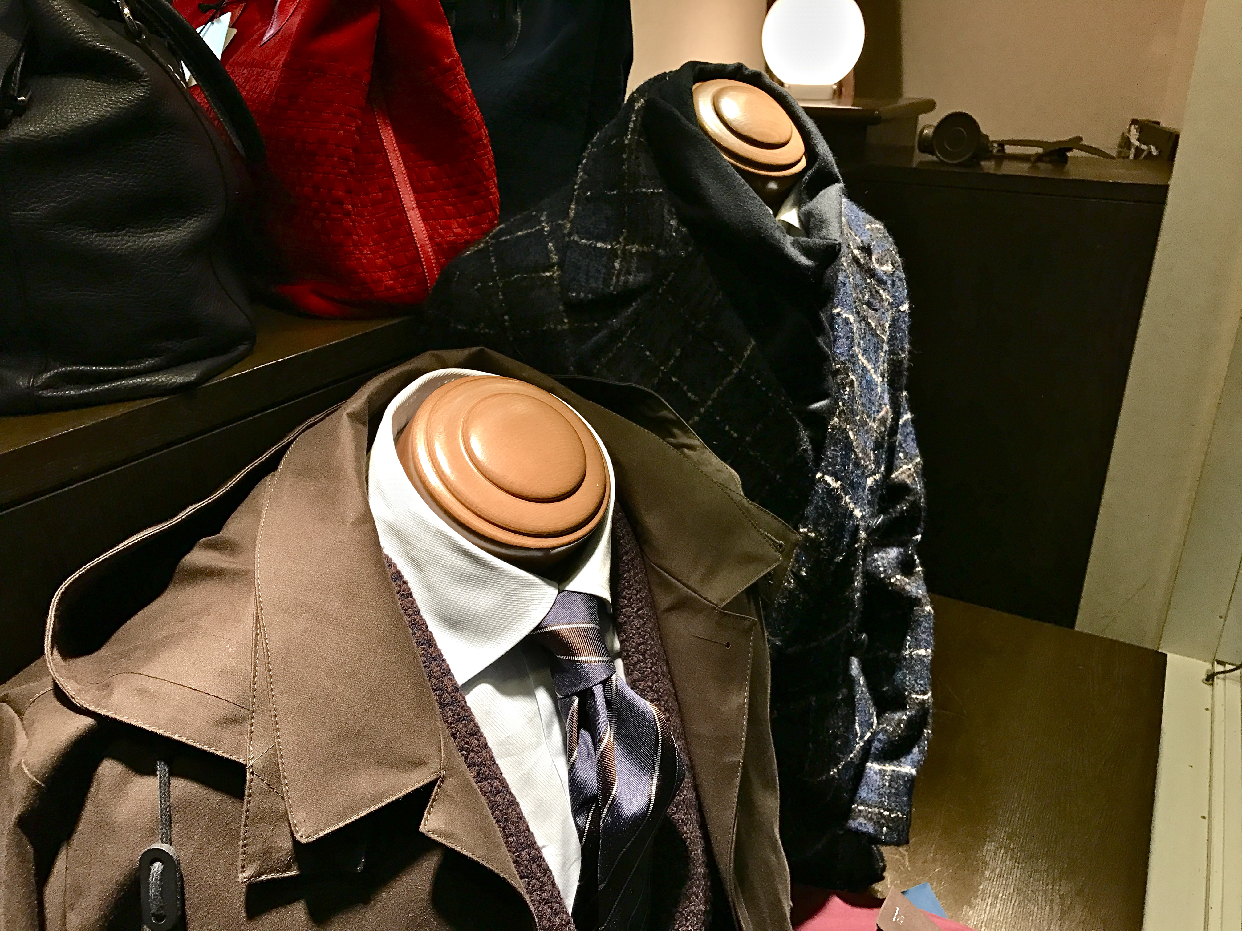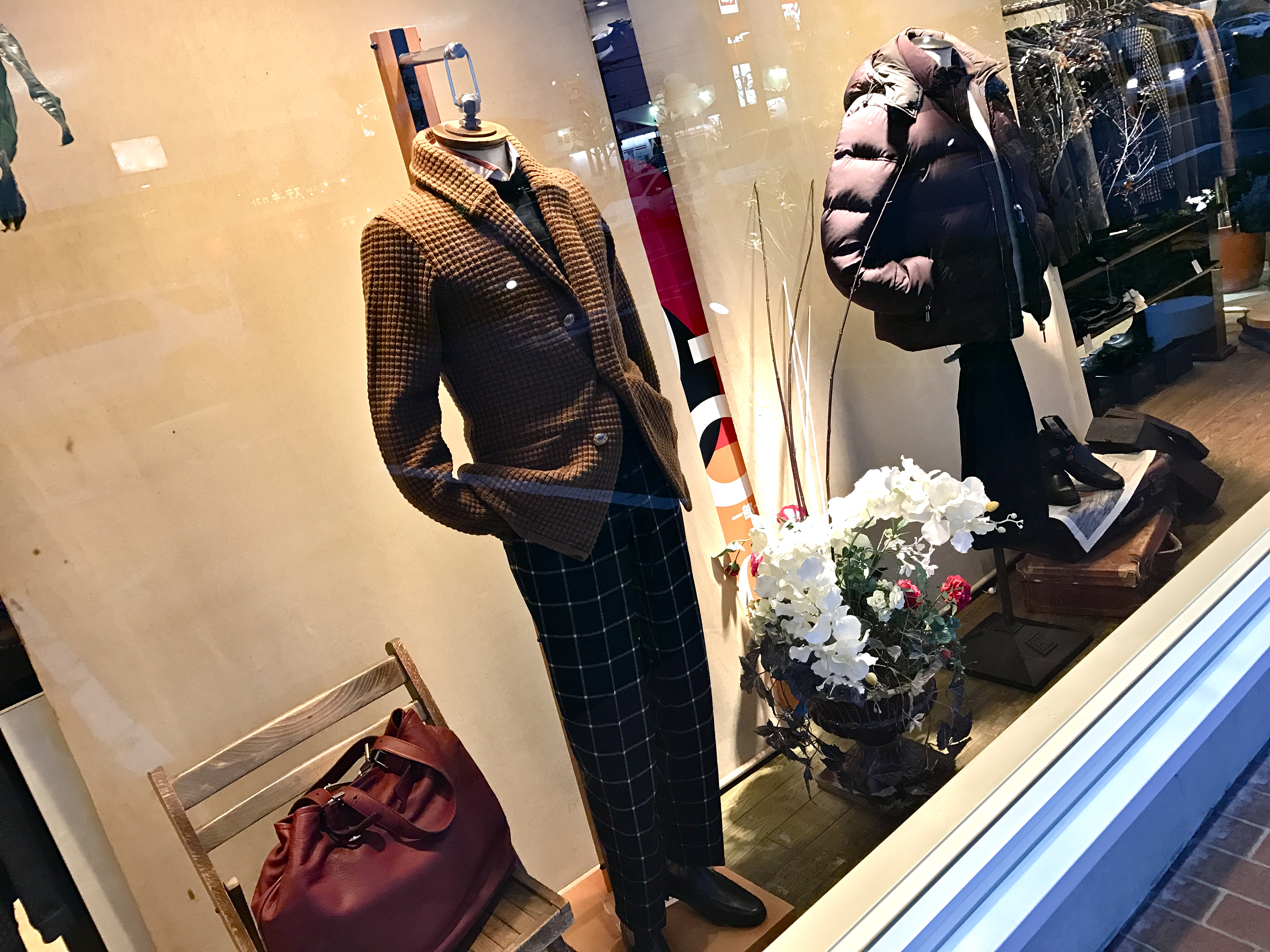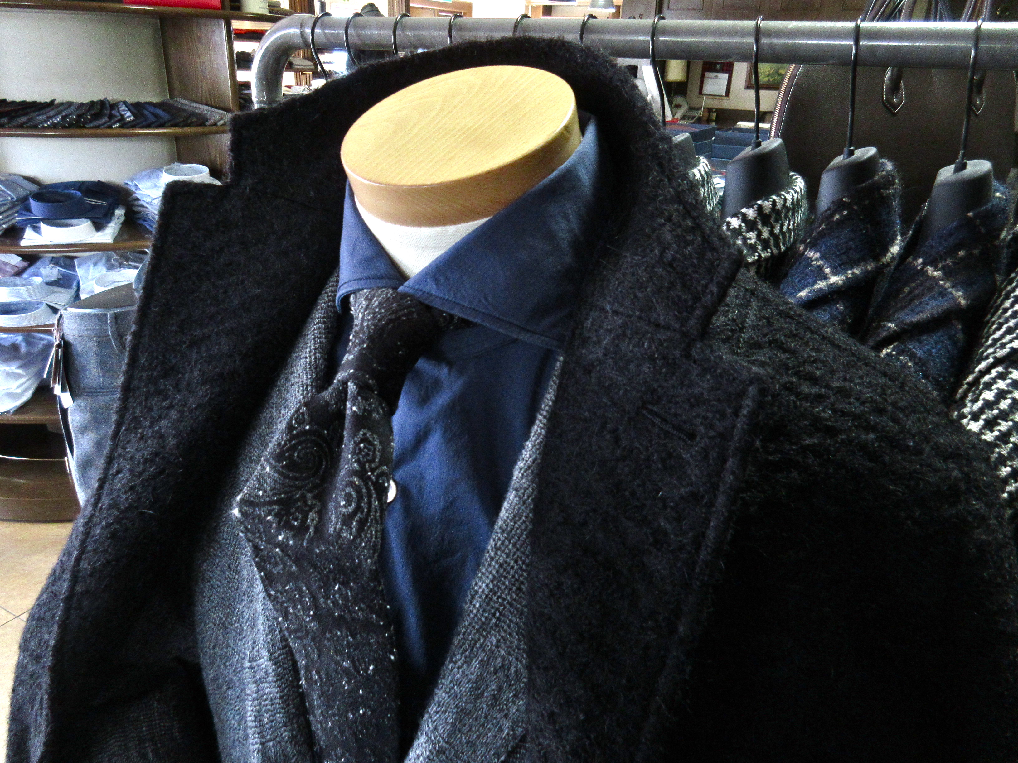 これからの時季に増えるフォーマルシーンなど、オケージョンを意識したディスプレイは、BOGLIOLIのハウンドトゥース柄スーツと共地のジレを合わせたスリーピース。そして、別珍ジャケットはZANONEのタートルネックに合わせたシンプルコーデで。ハズしの効いたTHE GIGIとは打って変わって、正統派の提案です。
