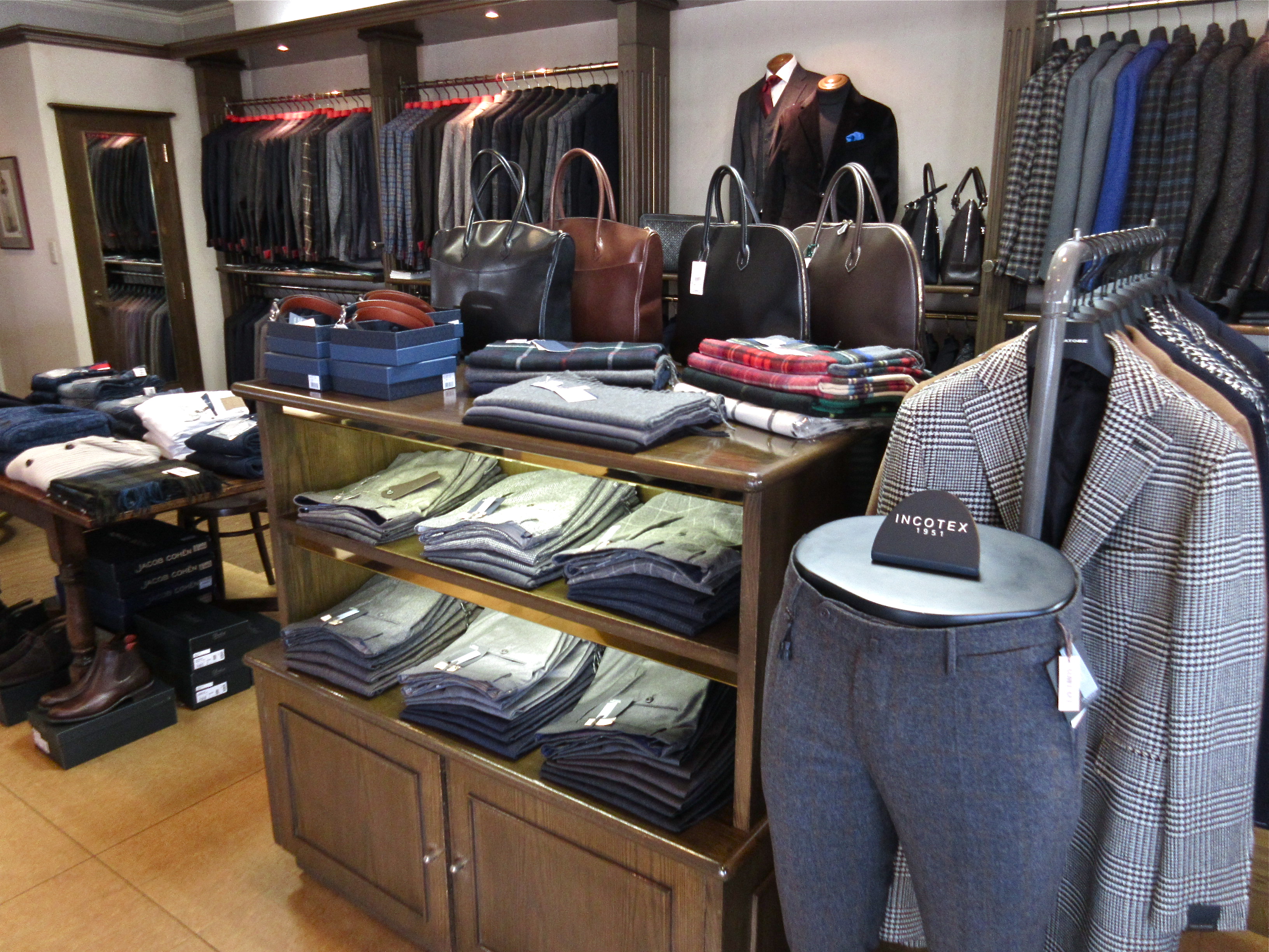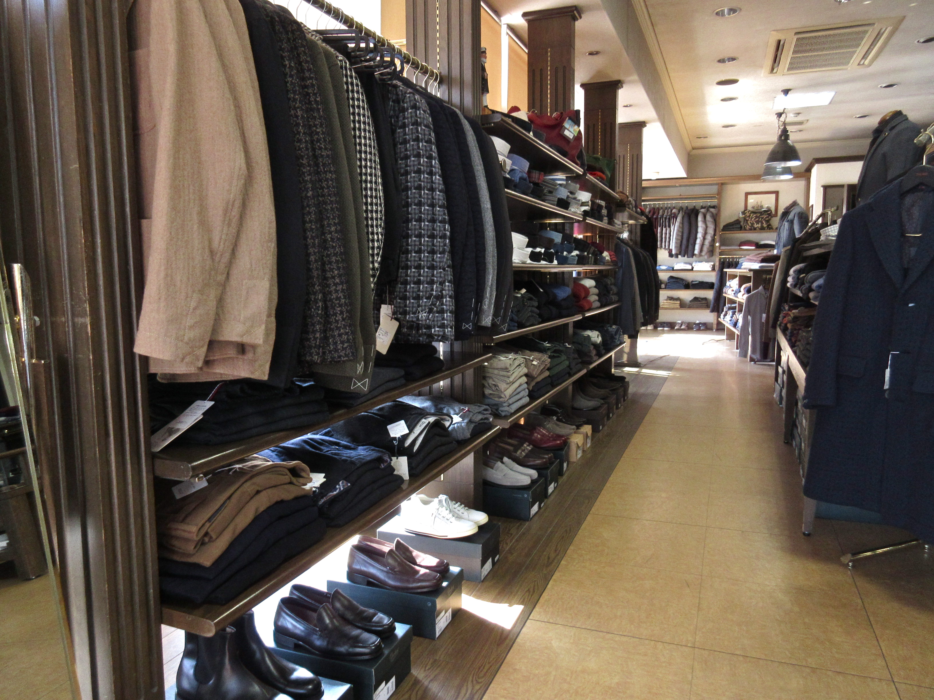 店内はワンフロアで、ドレスゾーンとカジュアルゾーンに別れています。ドレスゾーンは、ご覧頂きやすいよう整然と商品が並べられています。