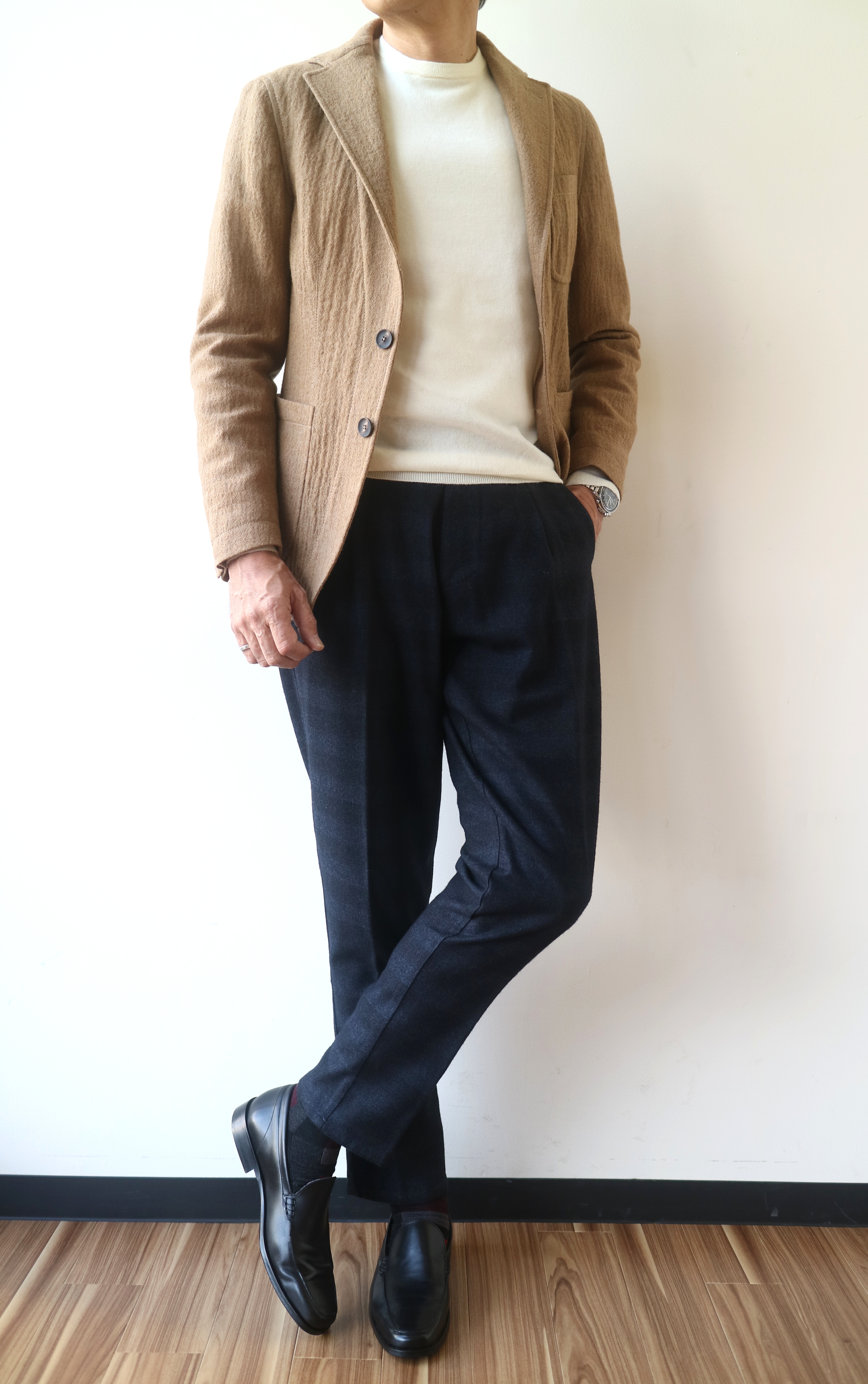 合わせたジャケットはTHE GIGI、ニットはGran Sasso(未公開)、靴下はDORE DORE(未公開)、靴はParabootです。