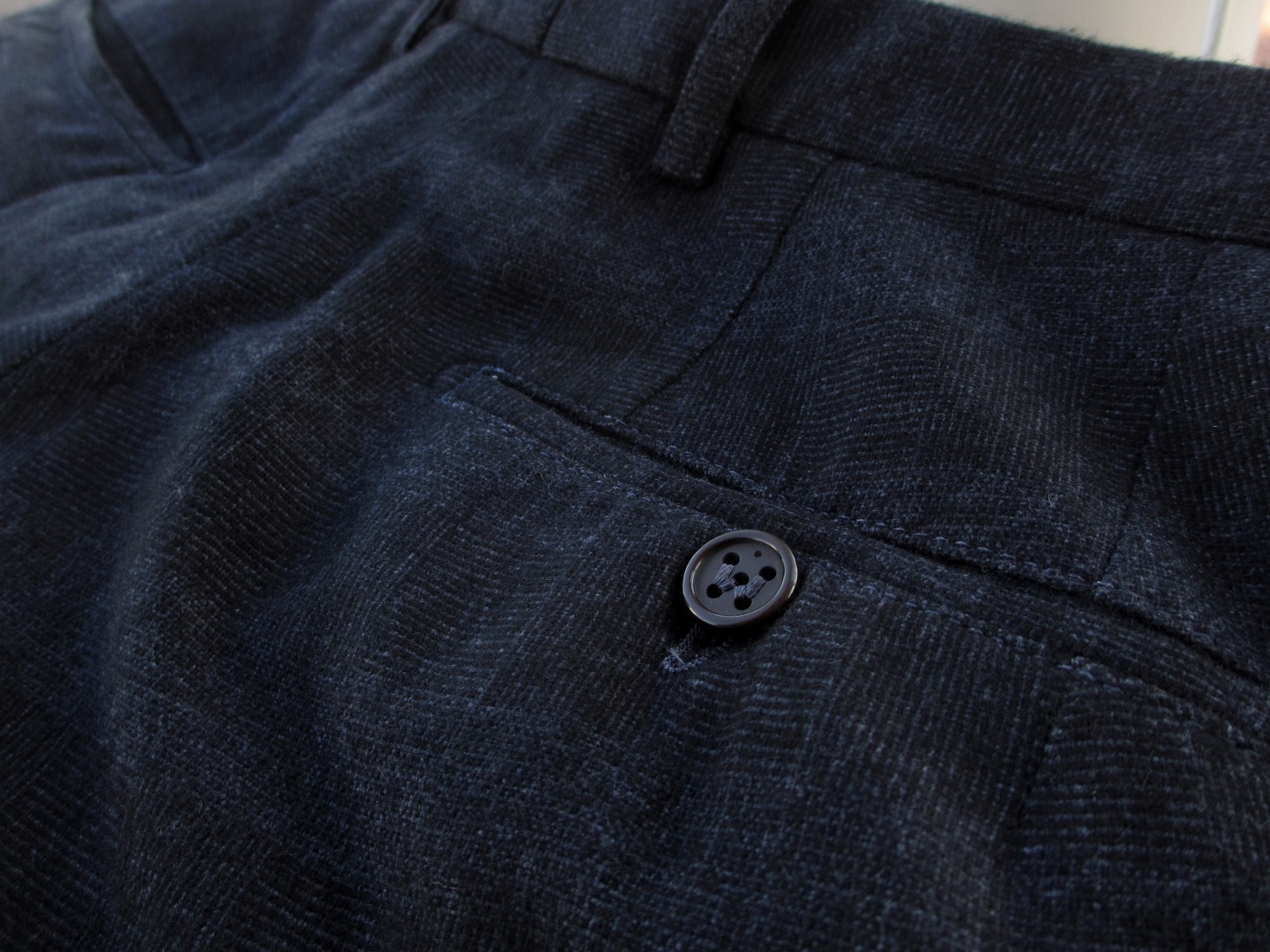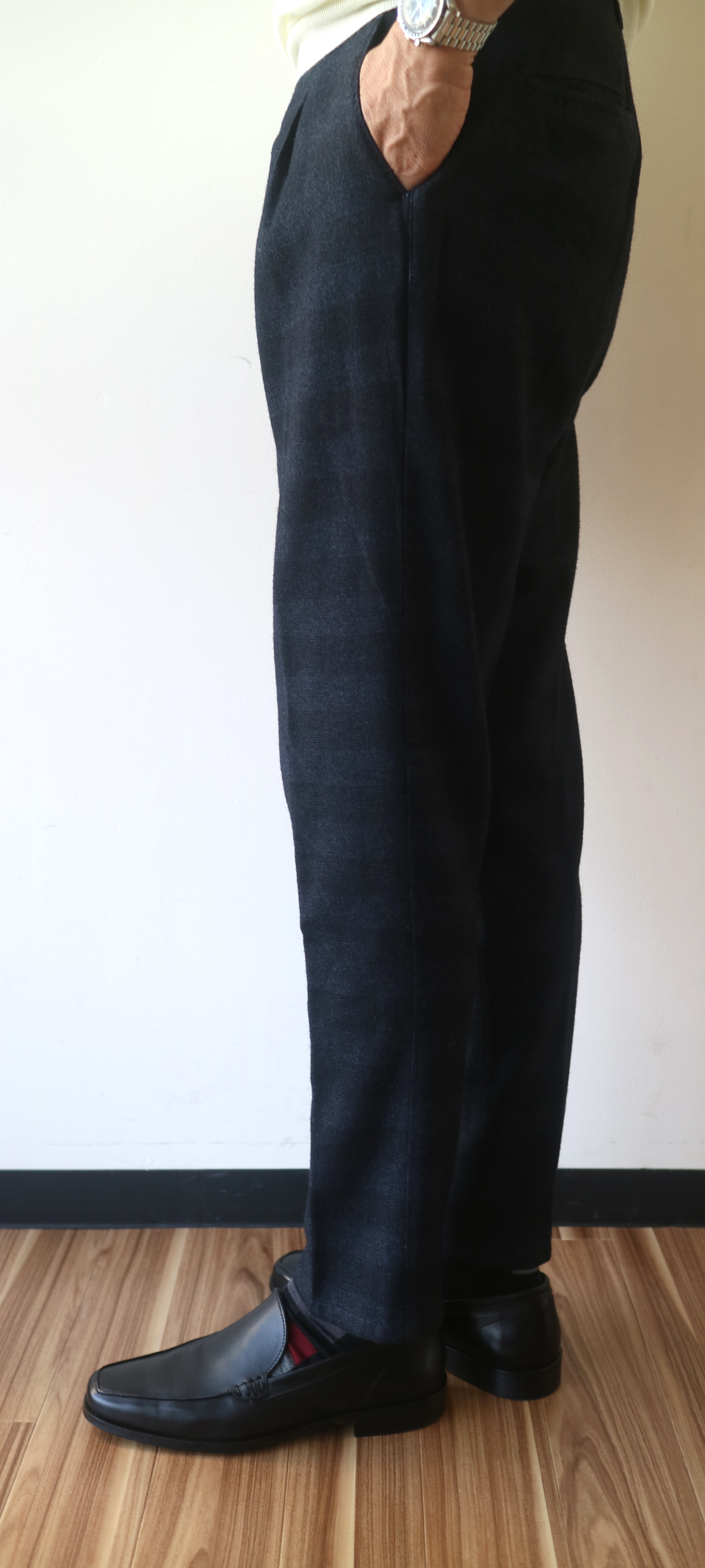 ウールナイロンのソフトでこなれた生地感は、製品染めならでは。ダークブルーのグレンチェック柄がシックな表情をも見せる、新鮮なパンツに仕上がりました。ジャージの穿き心地とは一味も二味も異なります。