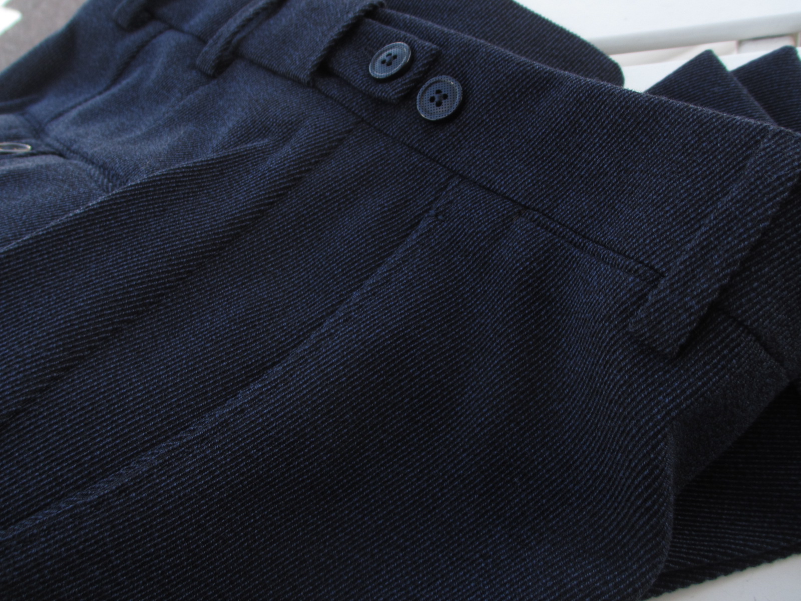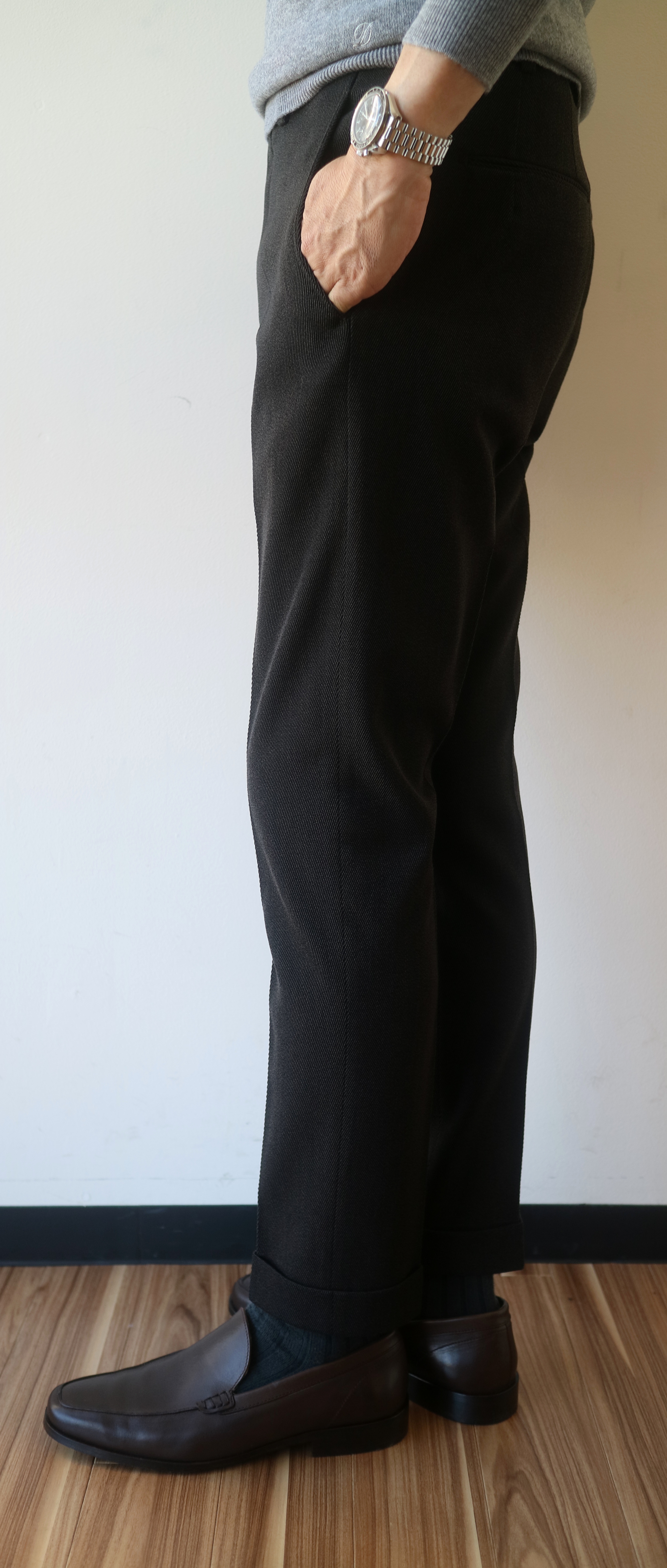 ウールなのにスポーティーな表情をもつキャバリー・ツイル。VIGANO(ヴィガーノ)でもセレクトしていました。生地名は"騎兵"に由来。丈夫で耐久性に優れていることから、コットンパンツが普及する前はスポーツ用として使われていた、クラシックな表情をもつ生地です。ただ、こちらはウール100%ではなく、ウールとコットンとの混紡。裾幅16cmのすっきりフォルムを楽しんでいただけます。