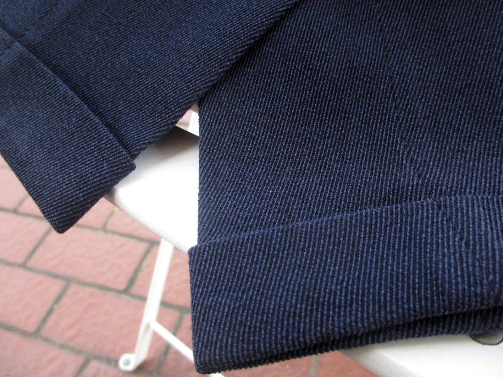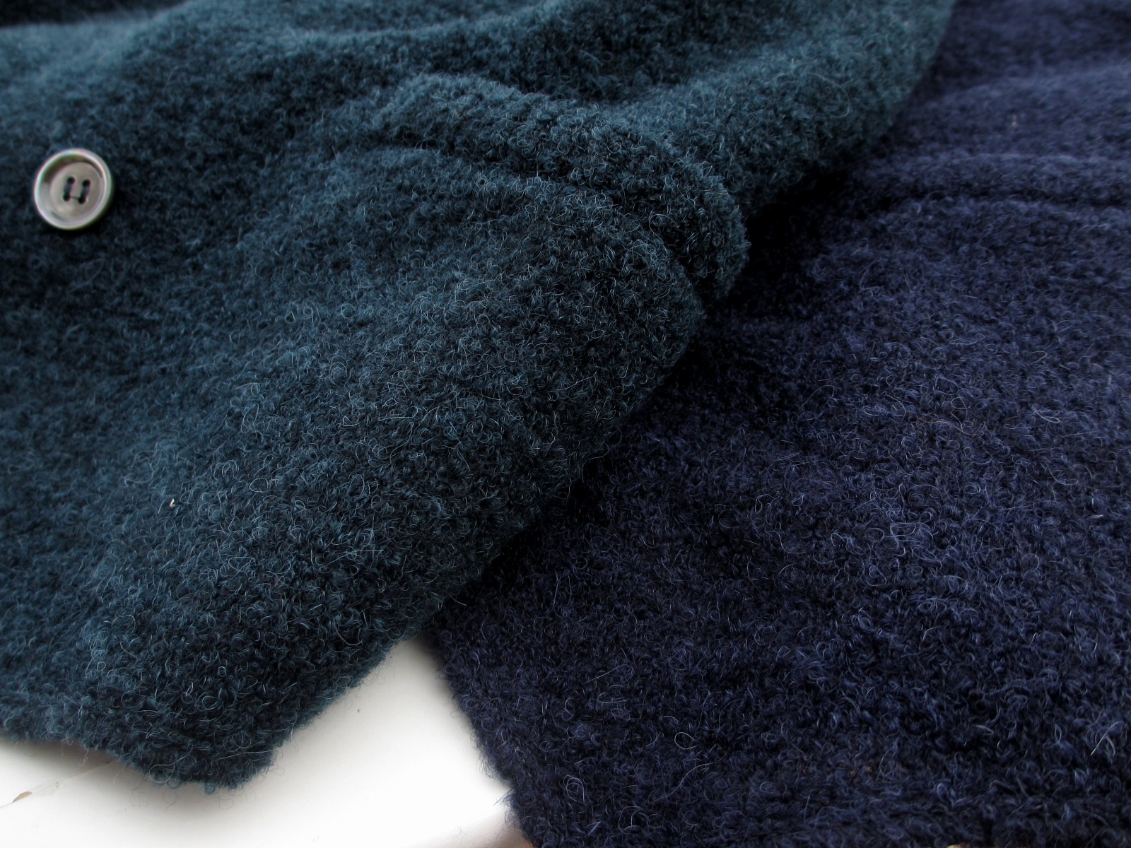 ネイビーの入荷より1ヶ月も早かったオフベージュ。残念ながら、サイズは44のみとなってしまいました。ただ、ネイビーも只の青ではありませんので、集中してご覧ください。暗いところでは、単色のネイビーに見えますが、よく見れば青の濃淡になっています。ケーブルなどの浮き出ている編地と比べ、地の青のほうが明るいのが分かるかと思います。この青のコントラストが光によって、なんとも美しい表情を作り出すのです。撮影時にカメラを向けたジュニアの手が止まり、値段を見て、頷いた姿が印象的でした。実は諦めたのかと思いきや、実は...です。まだ早いと言って、聞くかどうかは分かりません。