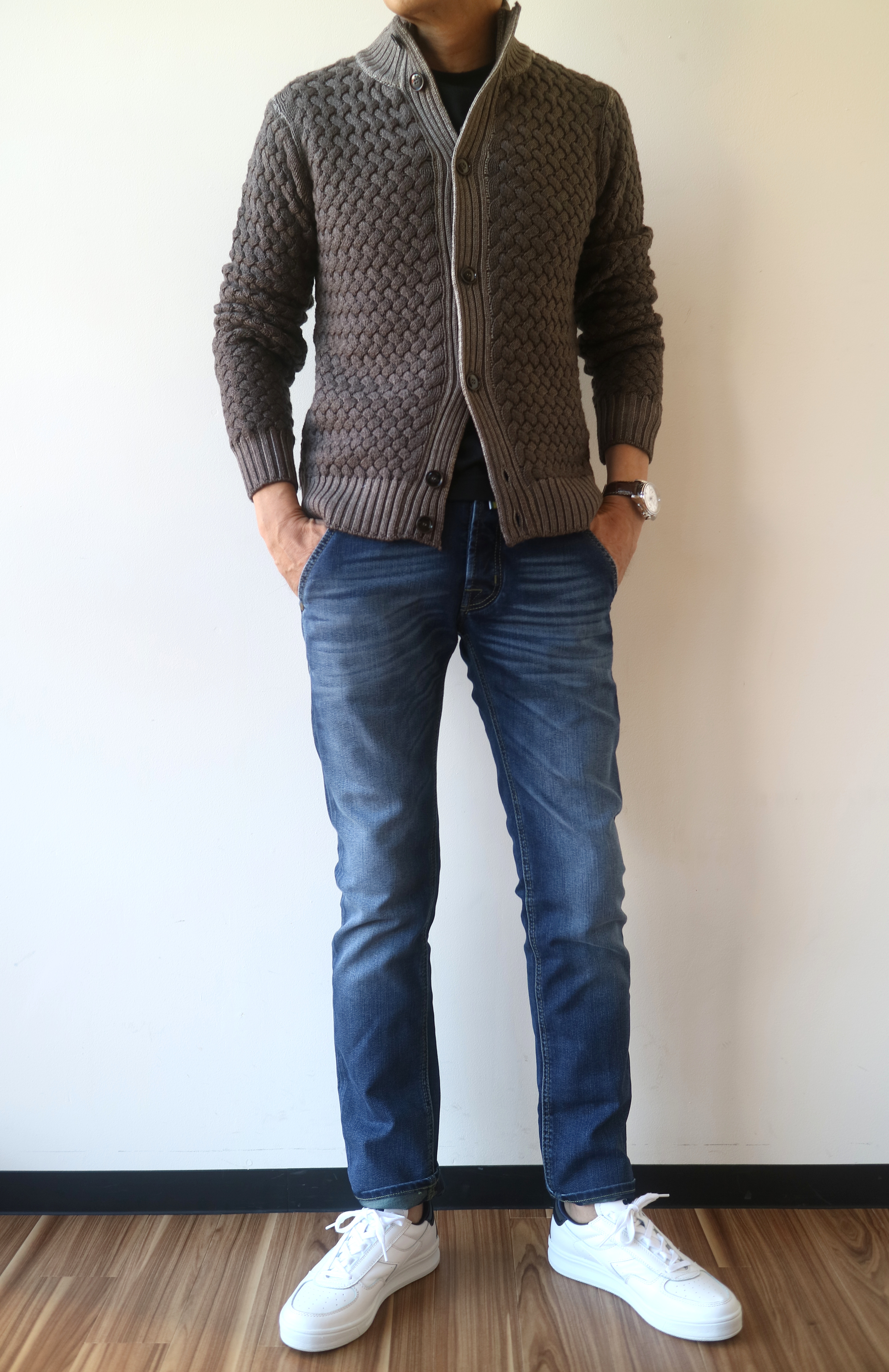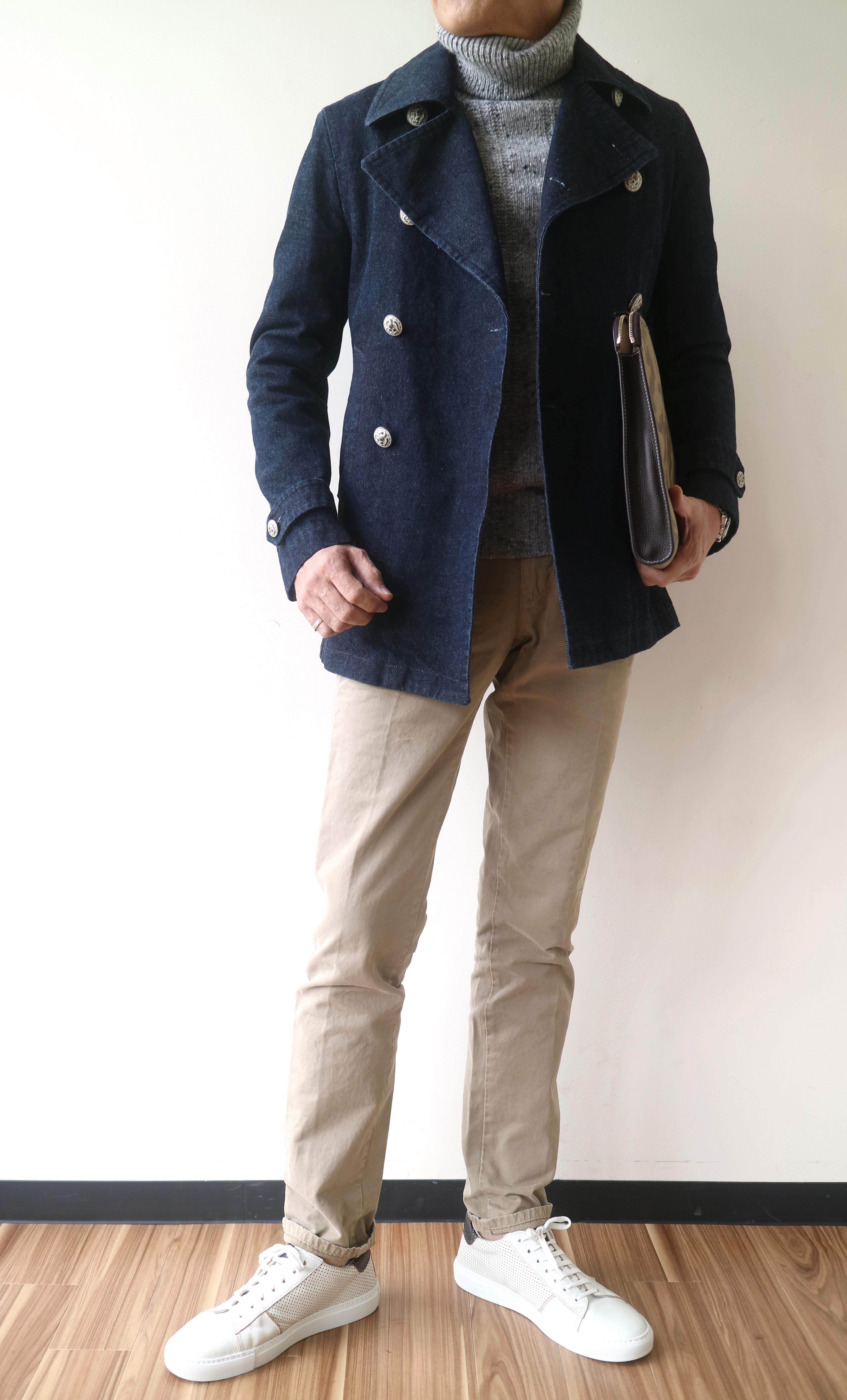 そして、もう一つ気になるコートに合わせてみました。ベージュのチノパンツにライトグレイのタートルネック。羽織ったのは、TAGKIATORE(タリアトーレ)のデニムPコートです。若々しいコーディネートは、若返りの秘訣?でしょうか。