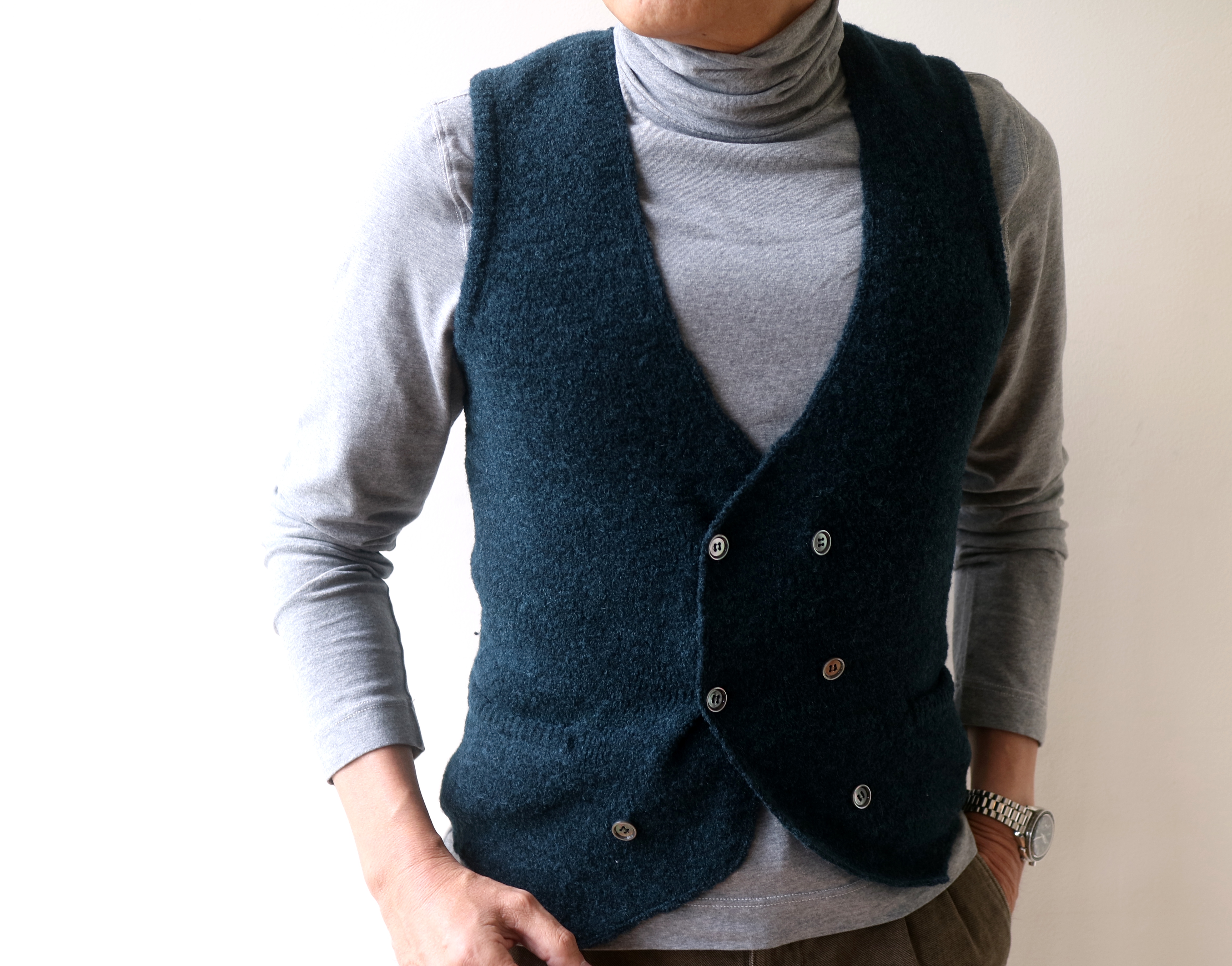 この春にもご提案させていただいたアルパカ混ウールのライトウエイトスプーニャ地 ダブルブレストニットジレ。あまりにも軽い着用感に、思わず個人購入しております。半袖のTシャツなどのカットソーの上に、冬素材アイテムのインナーにとシーズンを問わずに着ていただける優れもの。美しいシルエットも魅力です。