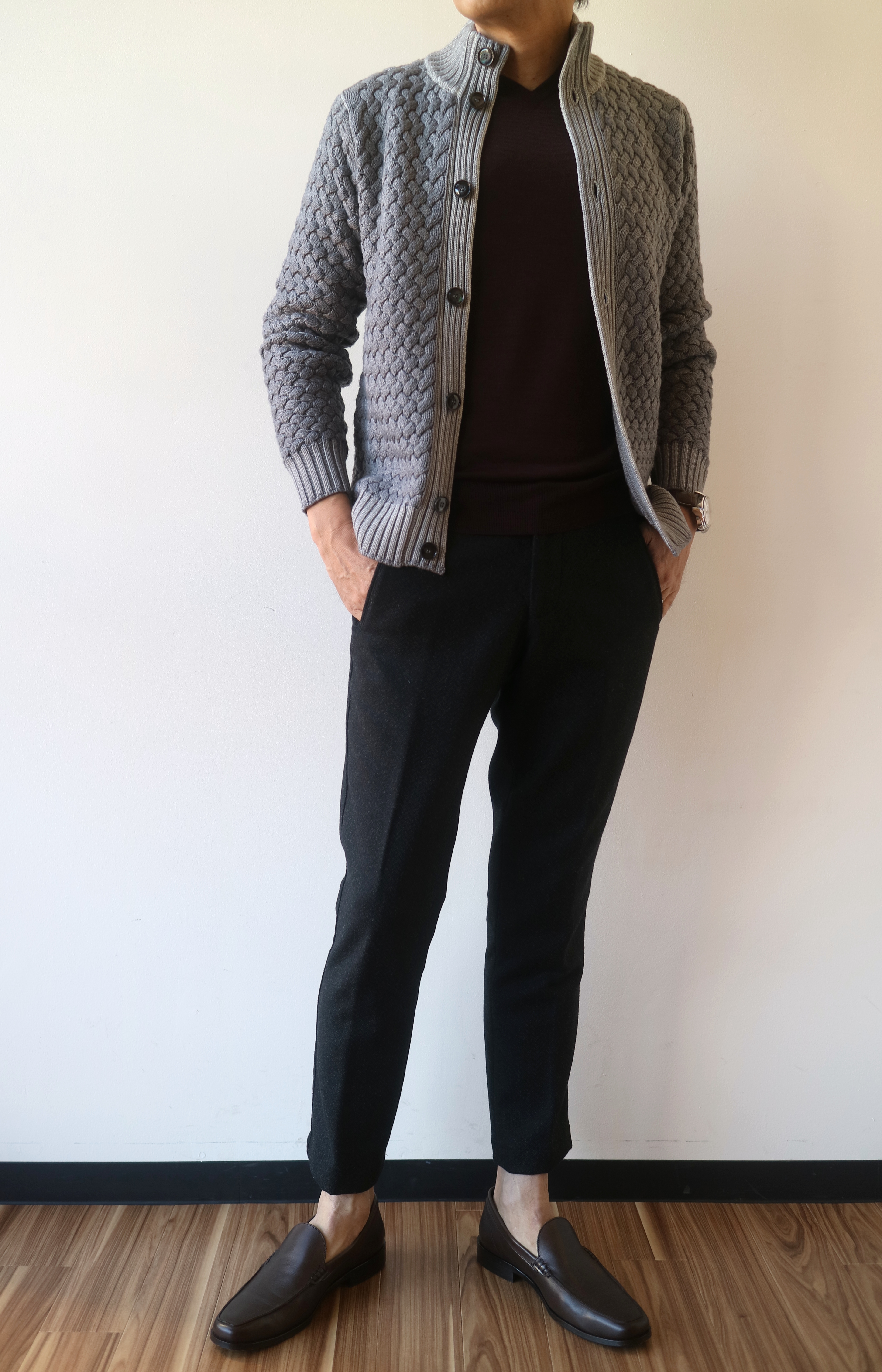 オリーブグリーン、ボルドー共にで合わせたニットはDrumohr、パンツはBERWICH(未公開)、靴はParabootのローファーとサイドゴアブーツです。