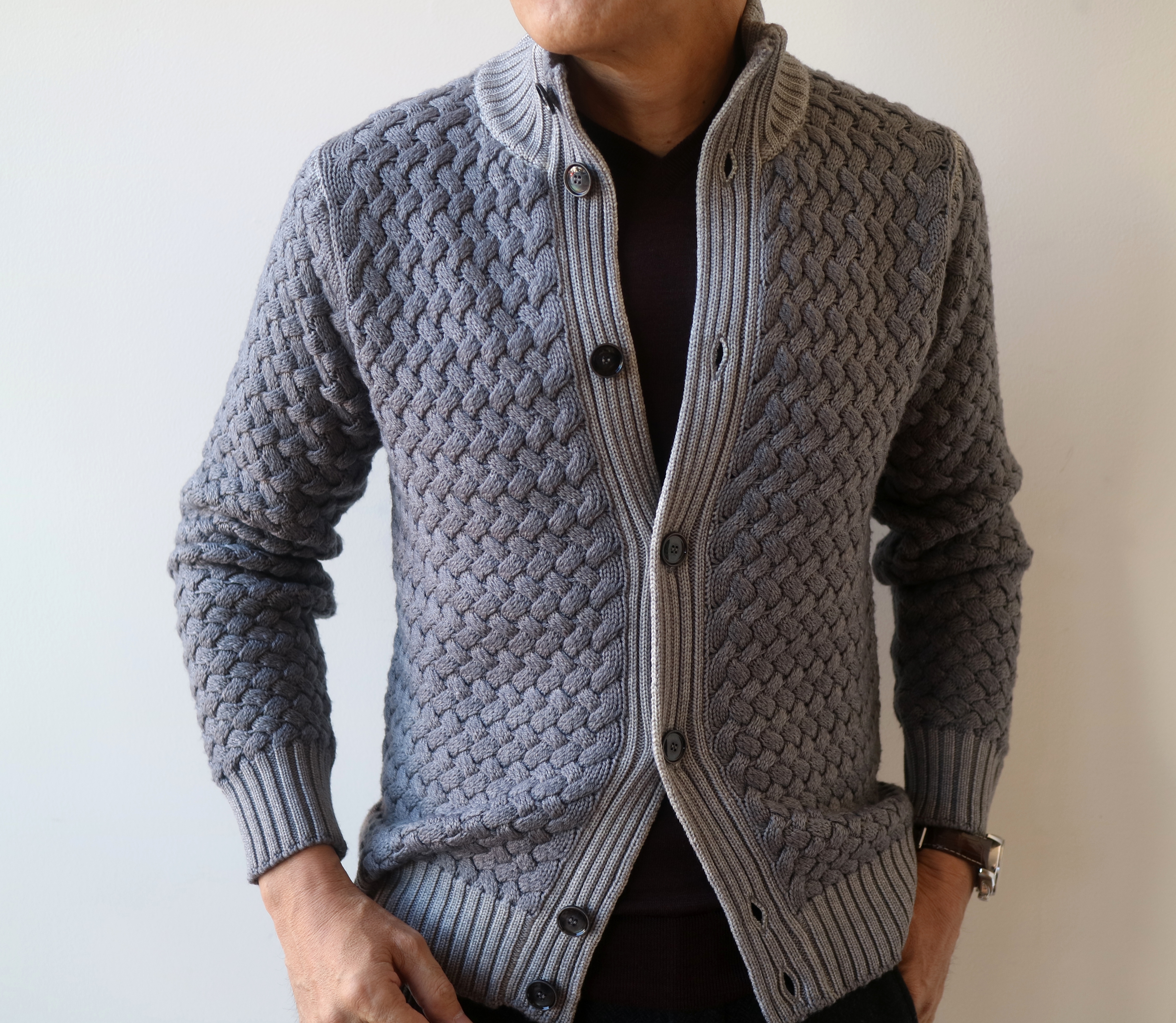 触れば、しなやかなウールを感じることができます。立体的に編みこまれたミドルゲージの立ち襟カーディガン。美しい編地に製品染め加工を施すことで、端正な顔立ちに、味わい深い表情がかもし出されます。イタリアの工場で伝統的な手法を用いて作りだされるニットは、それだけで人の手の温もりを感じていただけるはずです。
