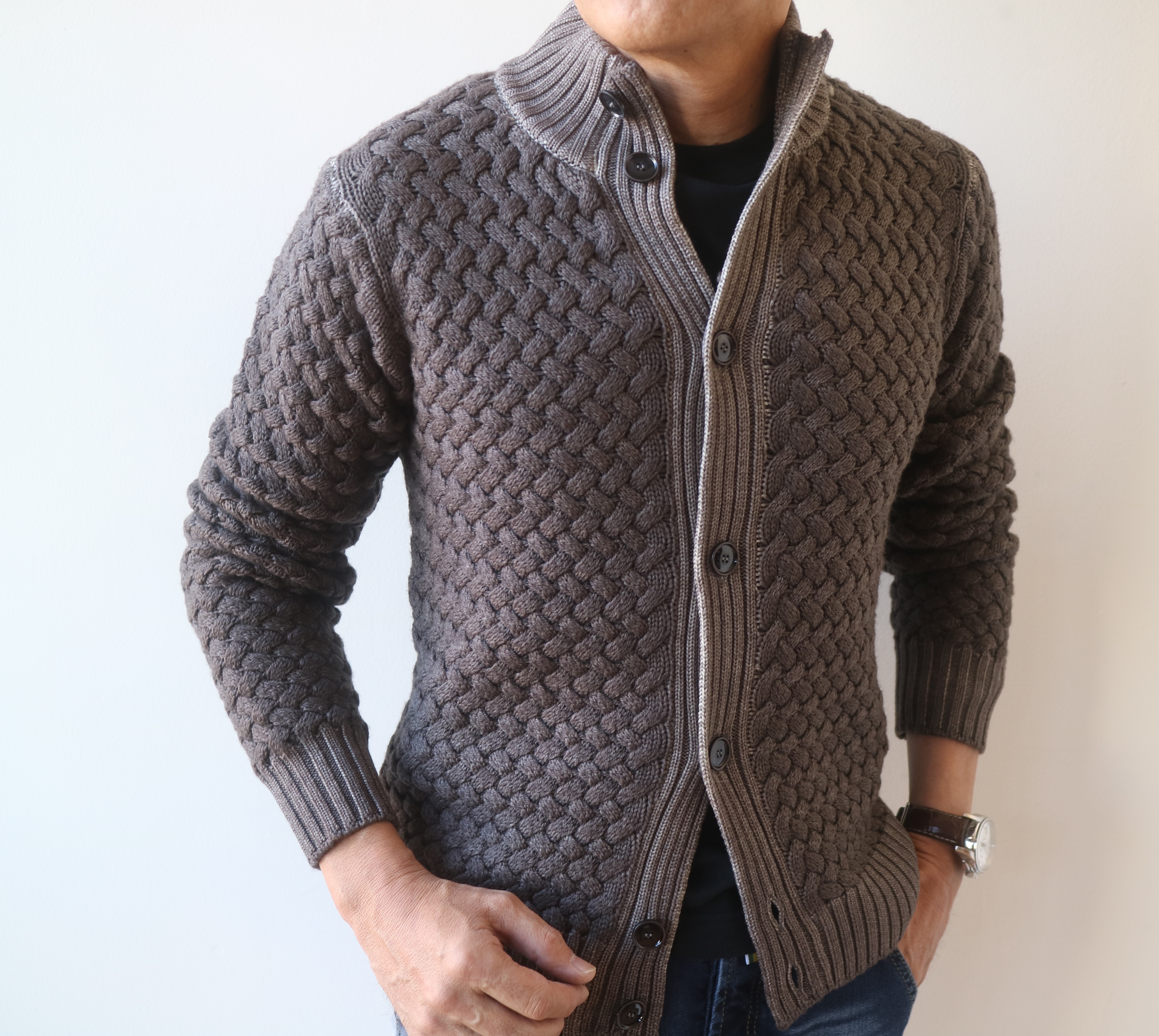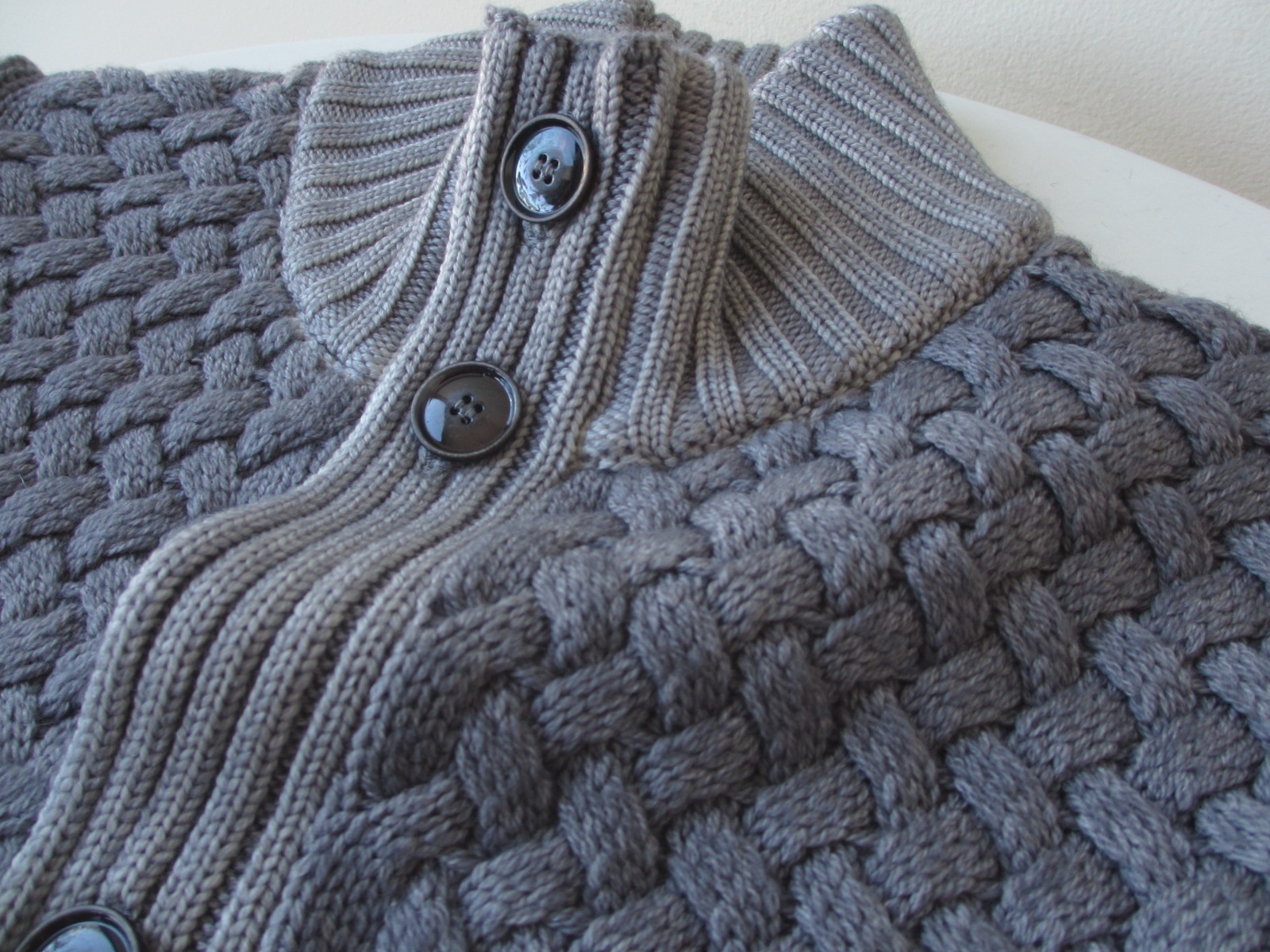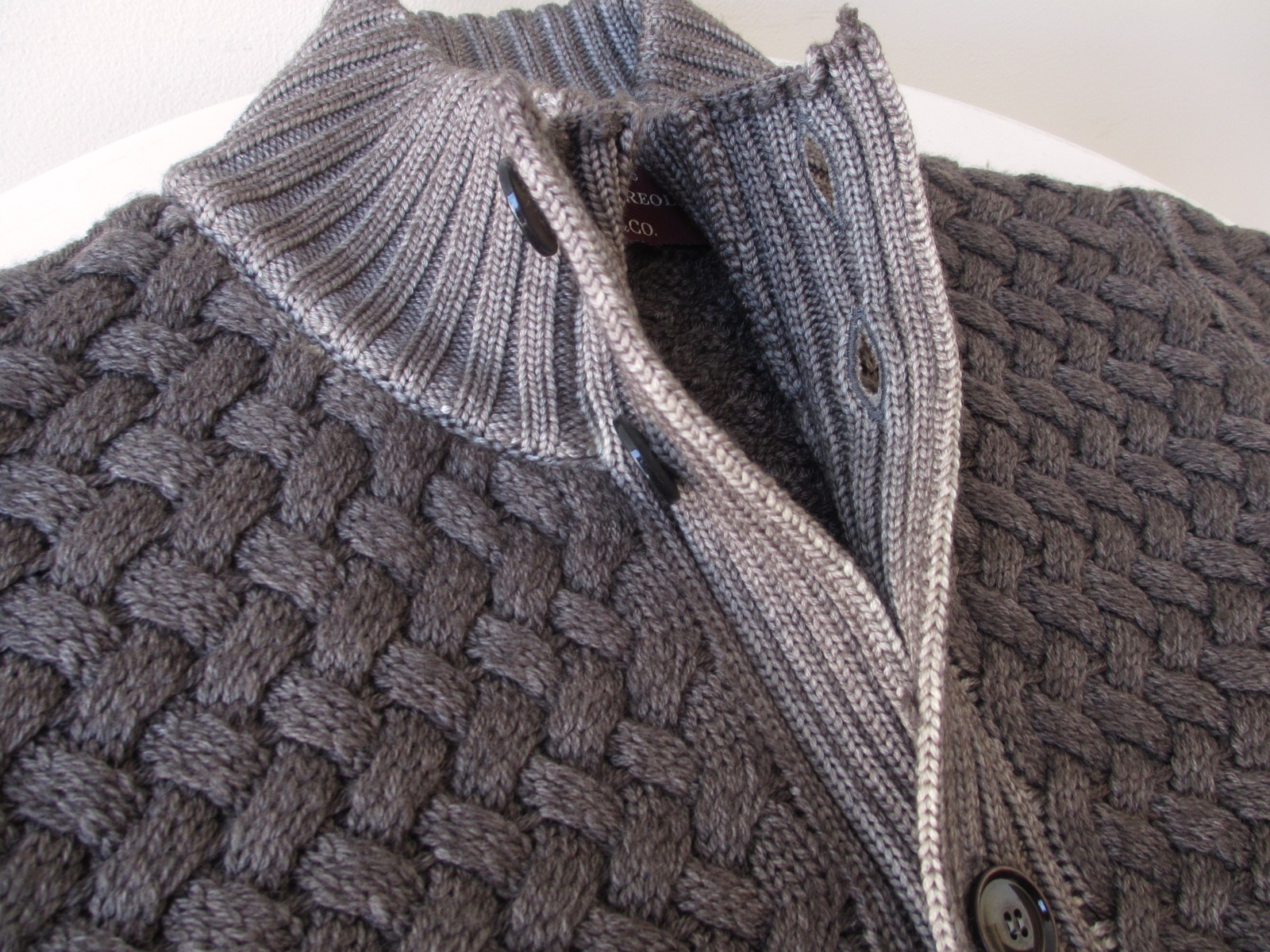 MODEL:製品染めバスケット編み立ち襟カーディガン