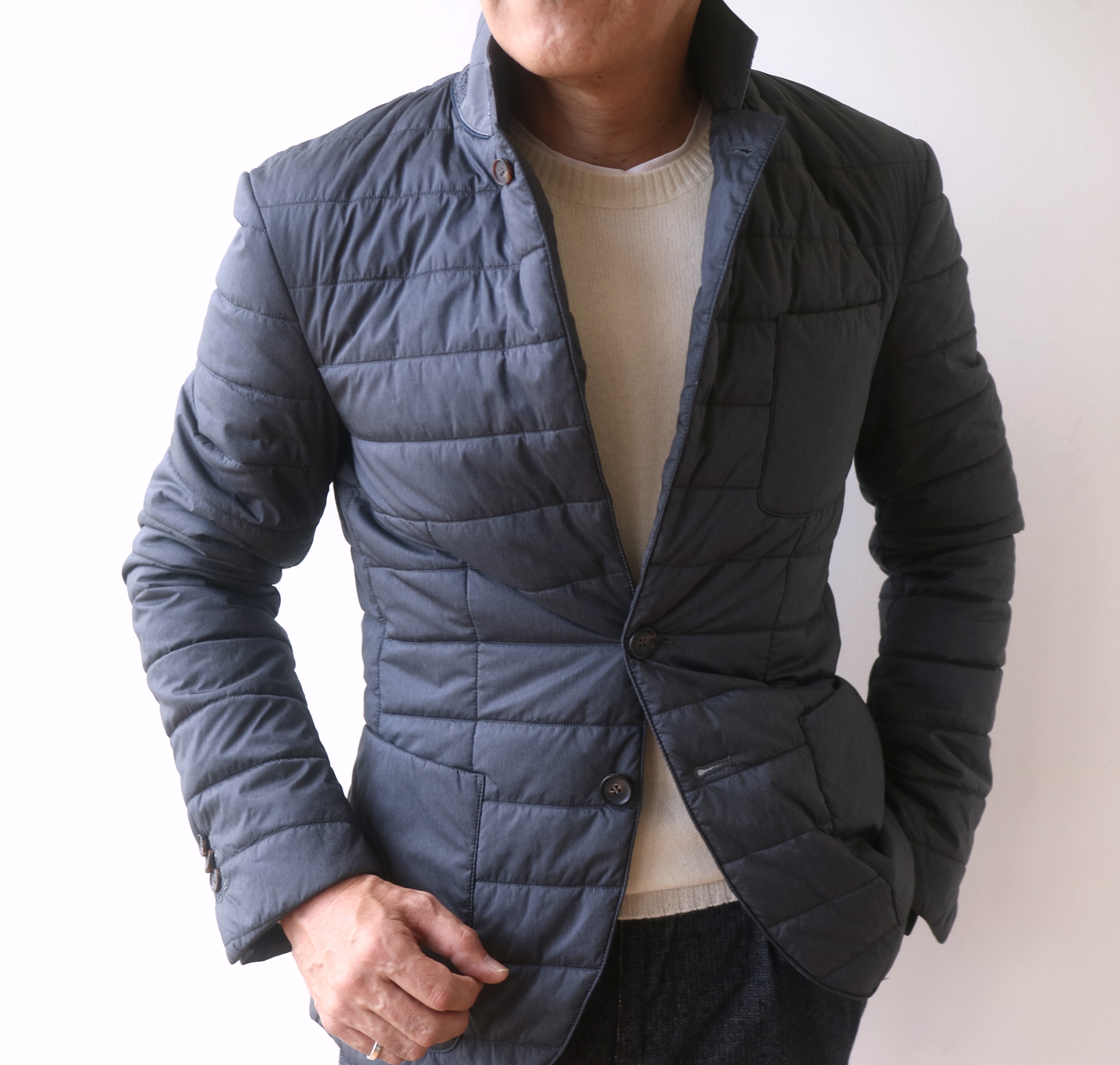 同じインナーダウンジレでもシルク・カシミアともなれば、リッチ感のあるコーディネートが完成します。しなやかな肌触りと上品な光沢、そして丸みのあるショールカラーが、とても魅力的。少し前に購入したジャケットに、ついつい合わせてしまいました。ナイロン素材のダウンジレを持っているだけに、撮影時から、ずっと「いいかも!!」を繰り返している私スグルでした。