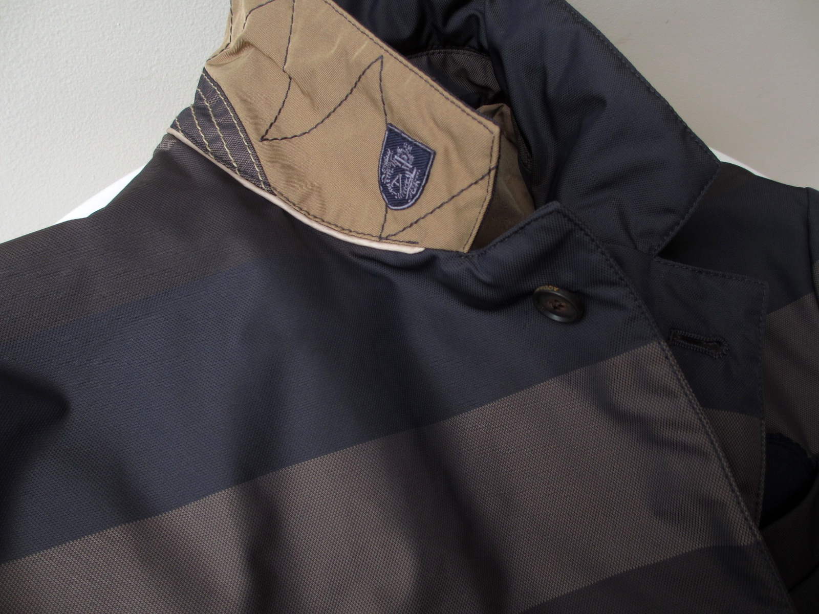 襟を立てれば、お決まりの場所にトレードマークのエンブレム。襟を立てて着るのが基本だけに、襟元はきれいです。内側のポケットは、両サイドの他に左側ウエスト部分にサブポケットが付きます。