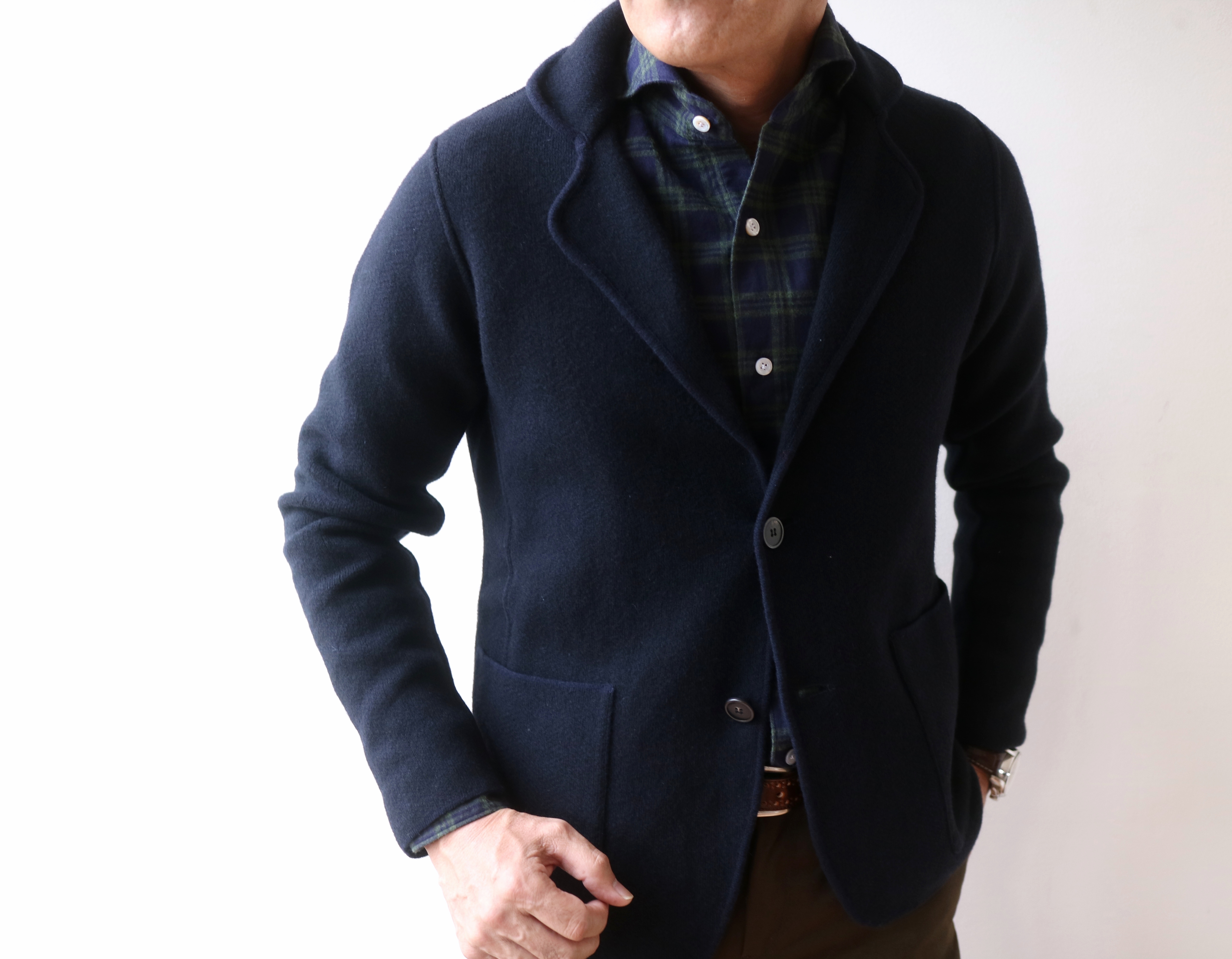 シンプルなニットジャケットです。体にフィットしながらも、余裕のある抜け感を作り出します。「なるほど」と頷いてしまうほど、洋服好き、特にニット好きな方にとっては納得の一着になることでしょう。言葉で飾るより、まずは試着してみてください。いや購入してみてください。共に歴史を刻むことの出来るニットになるはずです。