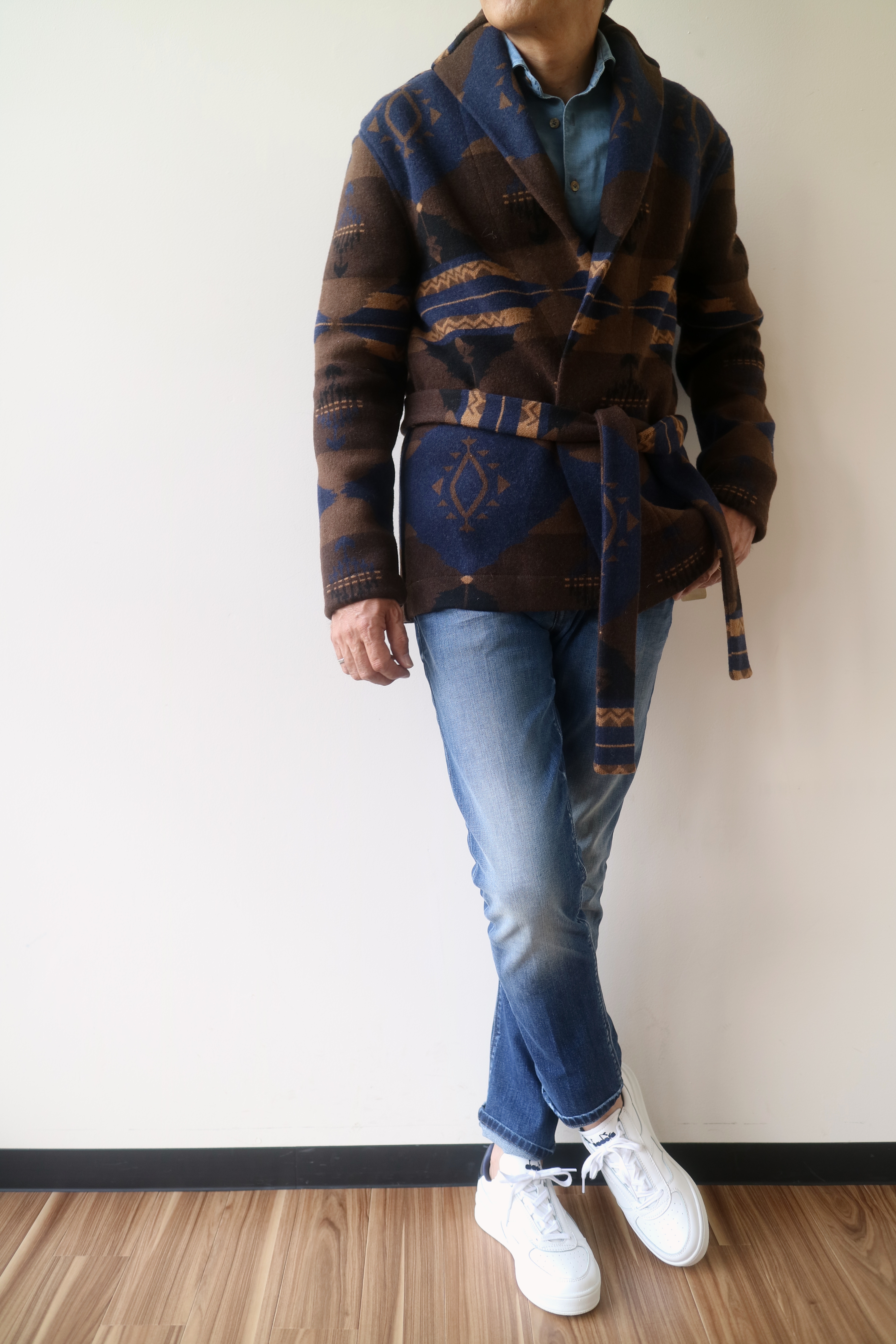 ネイビーで合わせたガウンカーディガンはDREW&CO.(ドリュー&コー)、タートルニットはJOHN SMEDLEY、デニムはJACOB COHEN、靴はdiadora HERITAGE、バッグはZANELLATO。ブラウンで合わせたジャケットはTAGLIATORE、シャツはBARBA、ネクタイはAD56(未公開)、パンツはPT01、靴はParaboot、バッグはCISEIです。