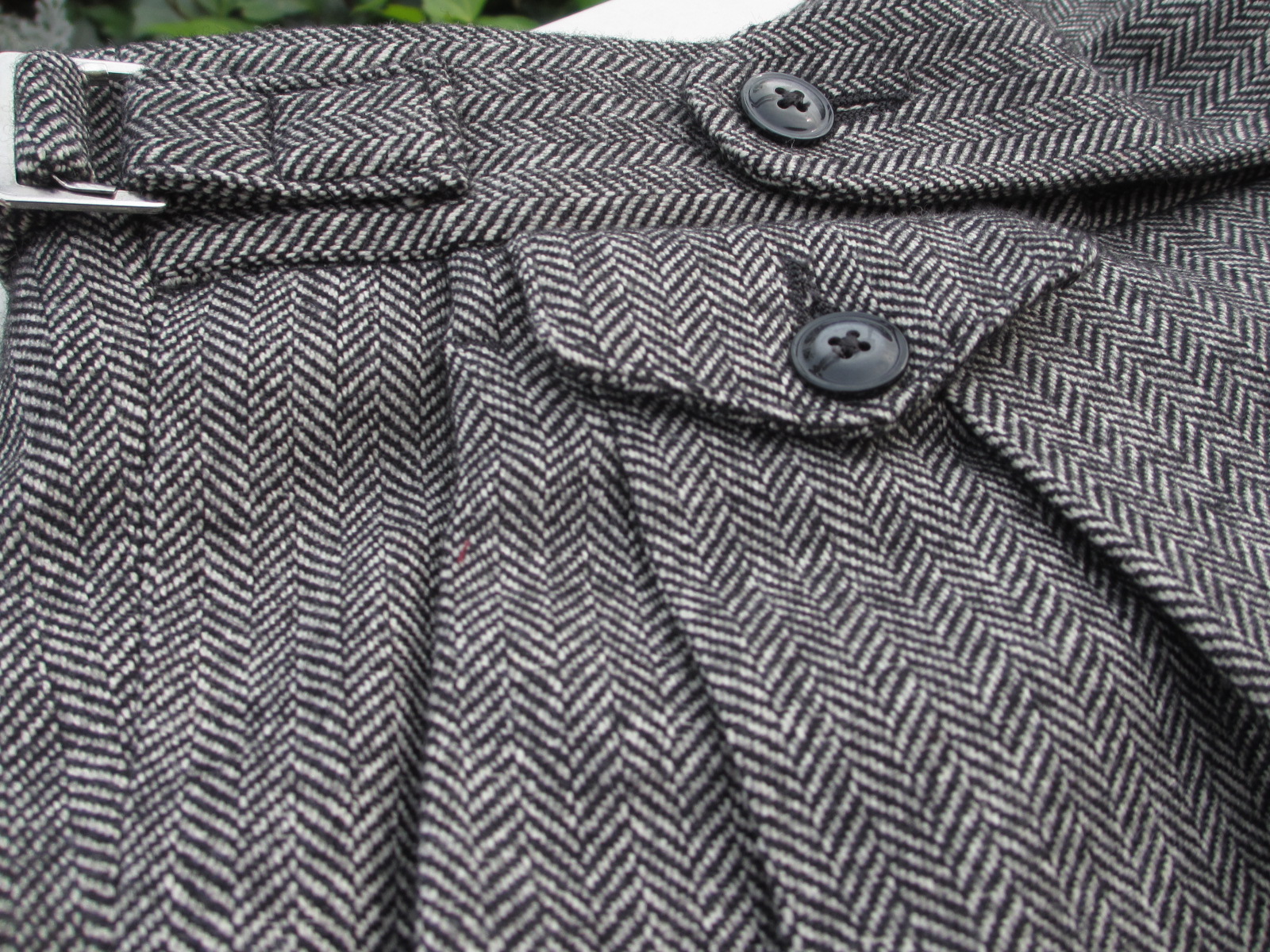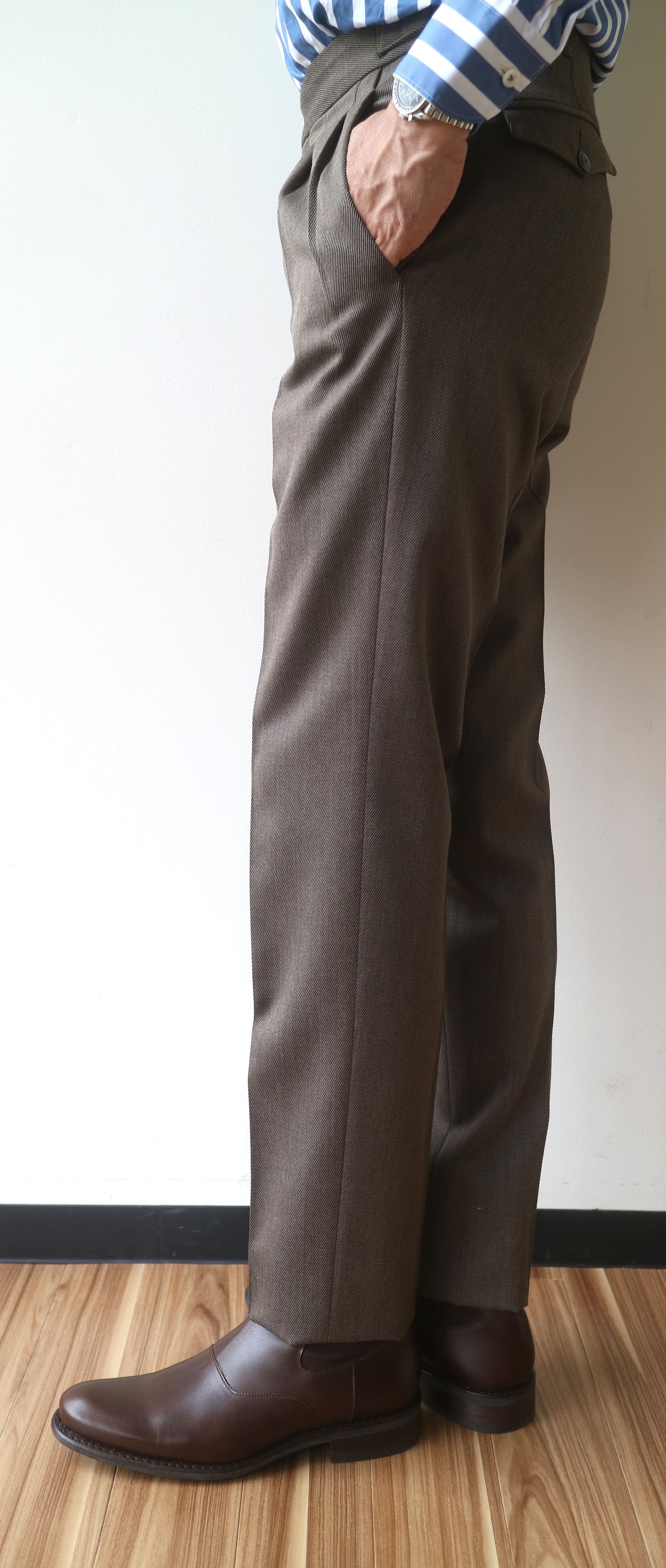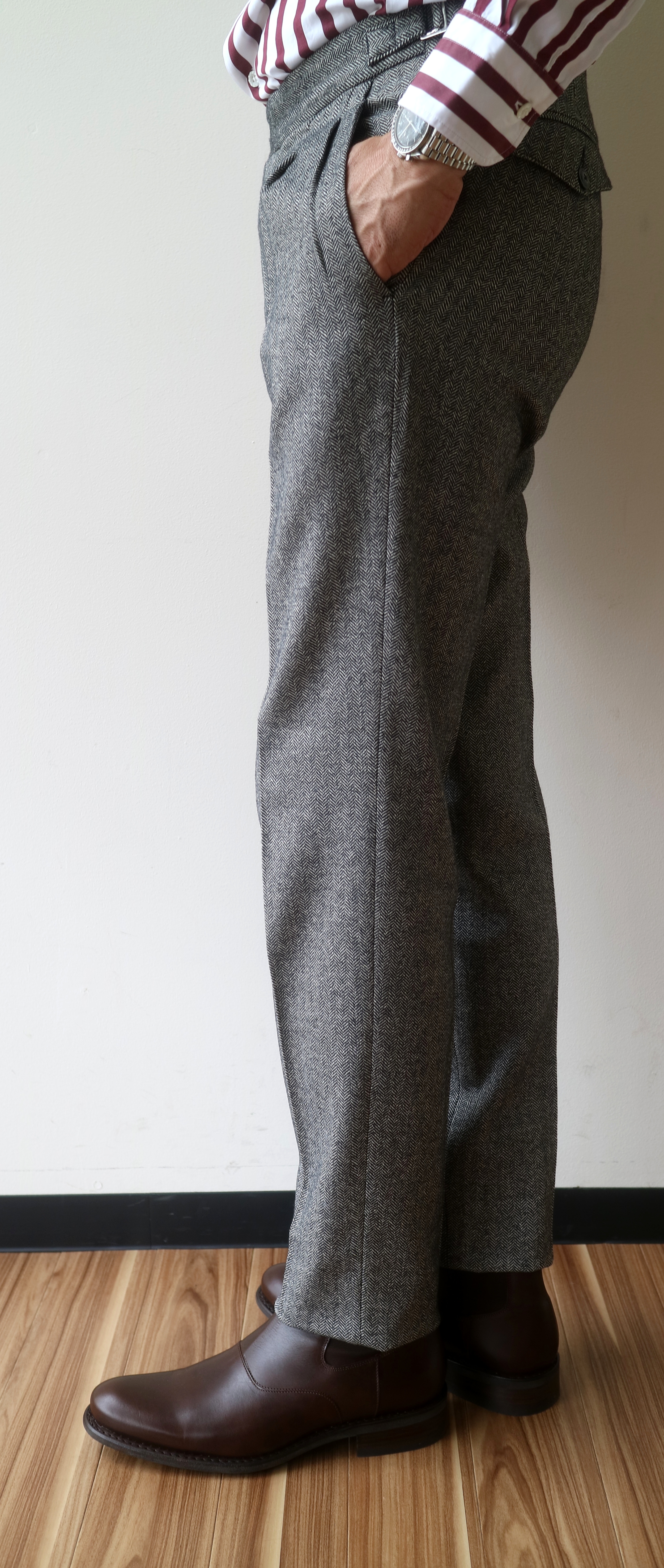 アウトのツープリーツにウォッチポケット。そして、サイドアジャスターベルト付き。コットン・ウールのグレイヘリンボーンも、このモデルにぴったりと合い、より一層、英国気分を盛り上げてくれます。「懐かしい!!」「新鮮!!」と世代によって、二方から声が聞こえてきそうです。