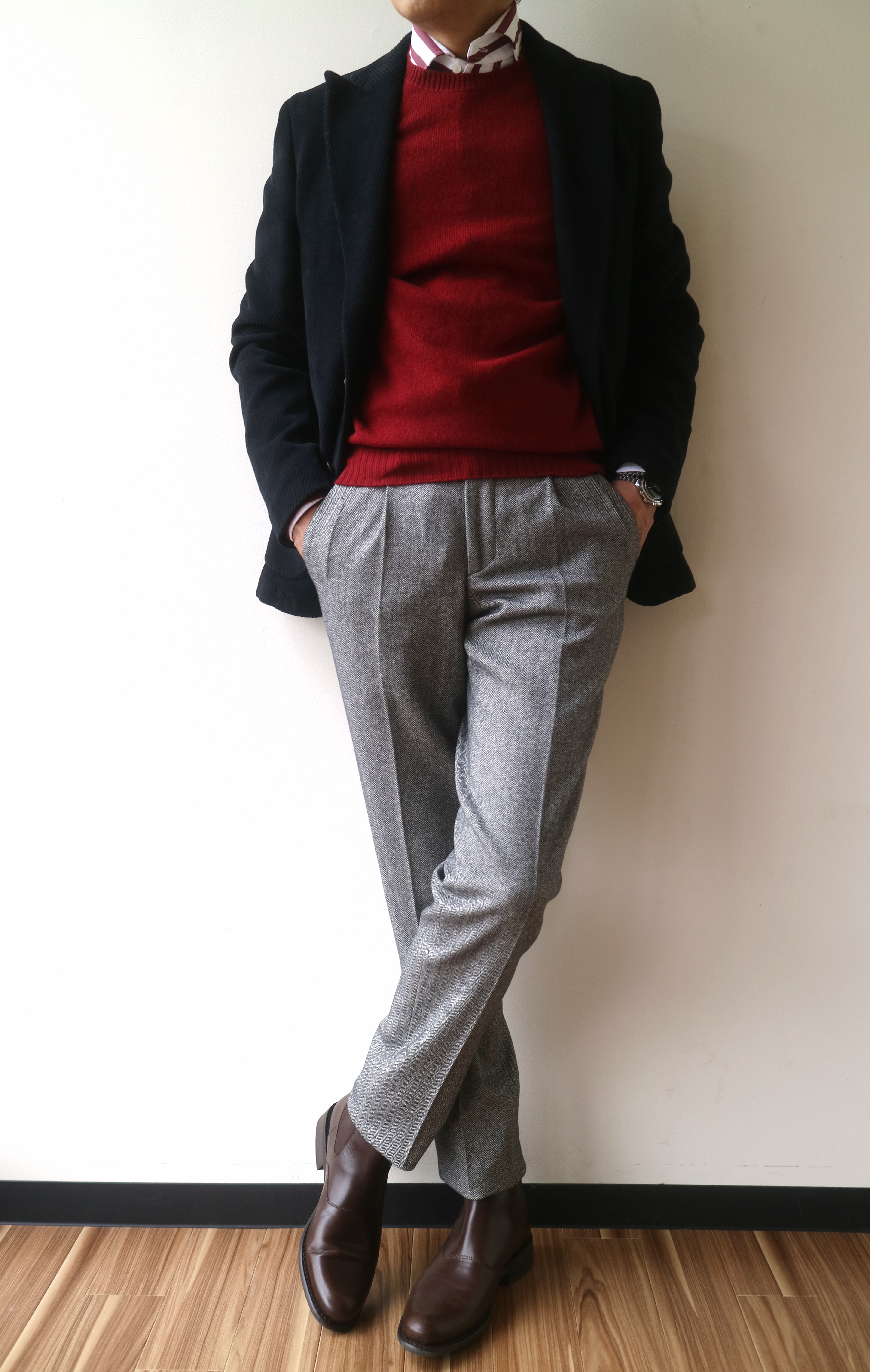 シャツにクルーネックのセーターを合わせ、ジャケットを羽織れば、英国正統のカレッジスタイルの完成です。不変のスタイルと言っても良いかもしれません。決して奇抜ななコーディネートではありませんが、さりげなさの中に漂うのは、知的さと気品です。