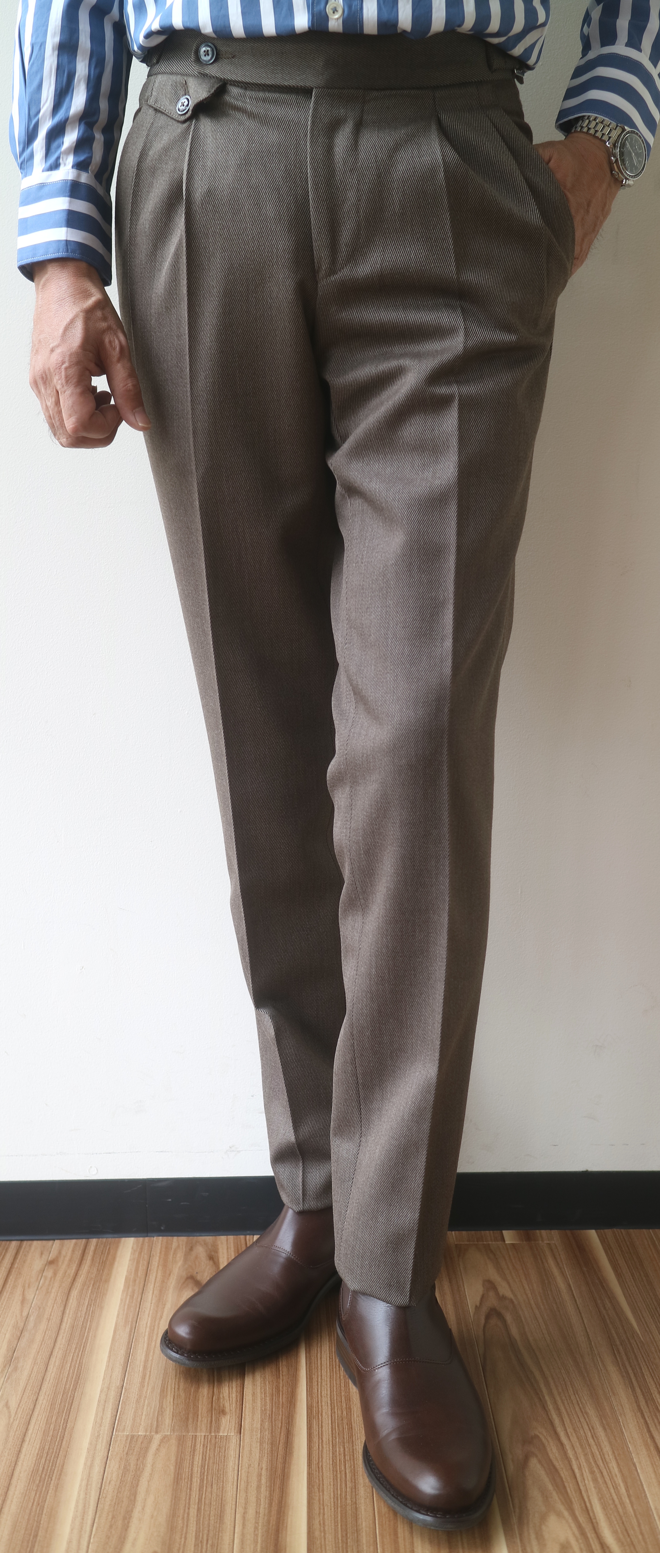 秋が深まるにつれて、温かみのある色合いに気持ちが傾きます。挿し色に使ったのは、ボルドー。昨日飲んだワインも赤、は余計な話でした。注目していただきたいのは、ボトム。クラシック回帰の流れの中、今季、各ブランドから提案されているプリーツ入りパンツ。ドレスからカジャアルに至るまで、様々な提案がなされています。そんな中、個人的にお勧めしたいのがベルトレスパンツ。イタリア・ブーリアの専業ファクトリー【VIGANO/ヴィガーノ】から、2型、お届けします。