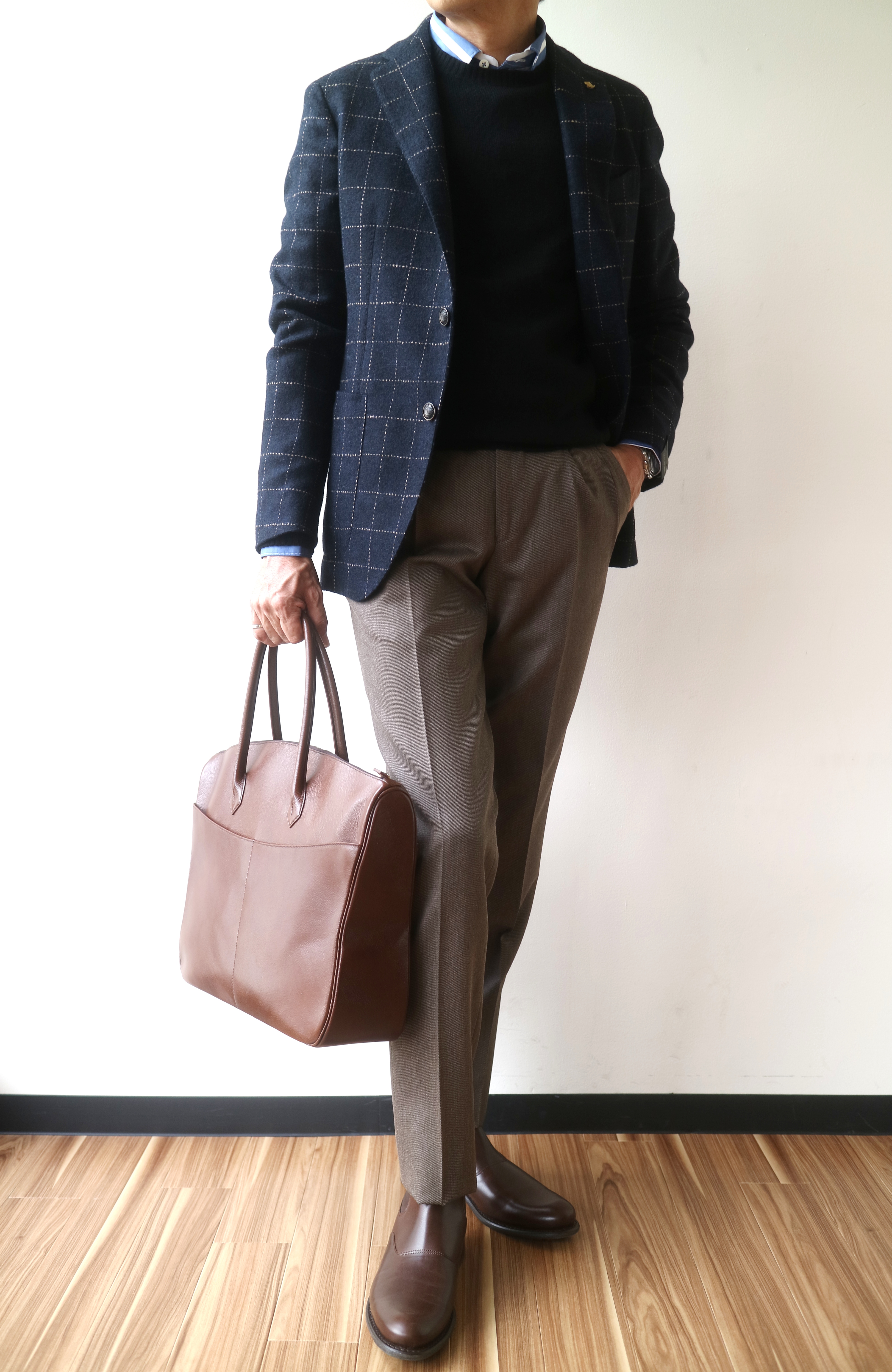 コーディネートで合わせたジャケットはTAGLIATORE、ニットはSCAGLIONE(未公開)、シャツはBagutta、靴はParaboot、手に持ったバッグはCISEIです。