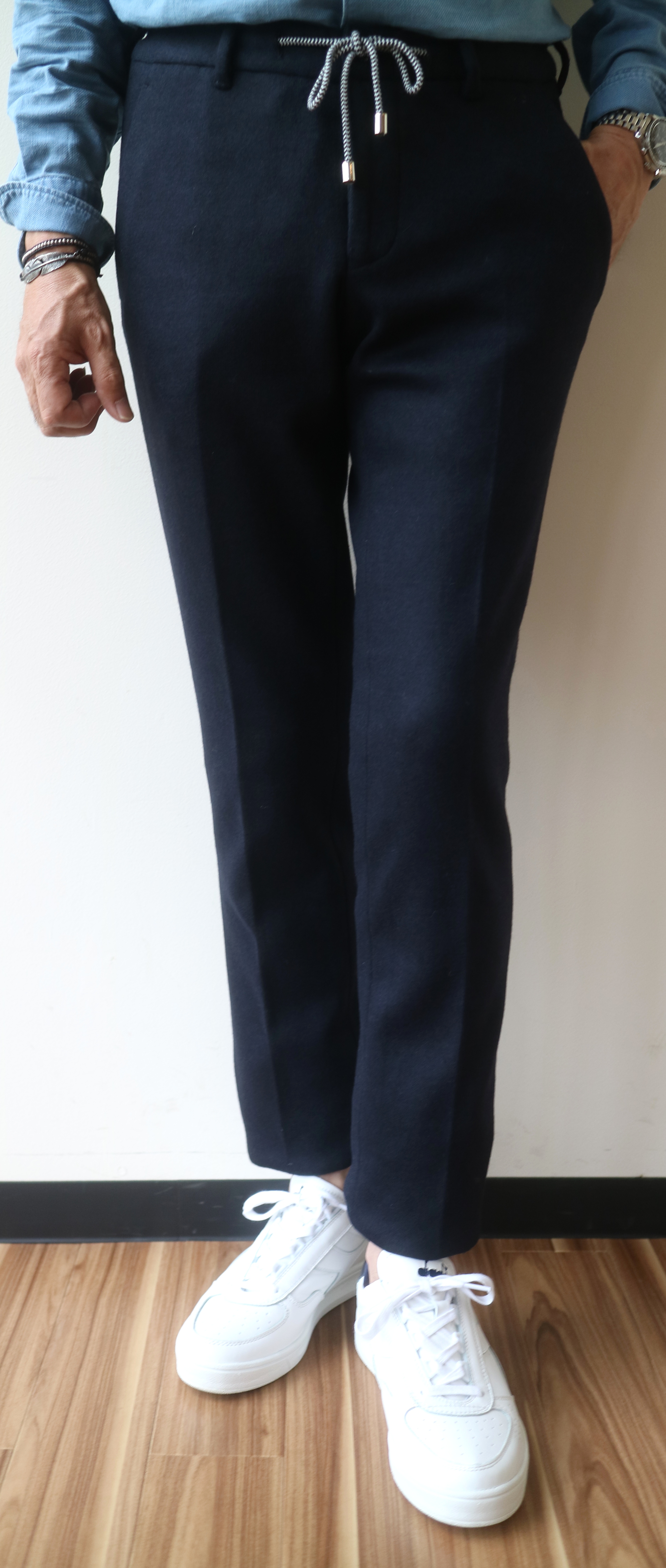 モデルは身長175㎝、体重63㎏、胸囲91㎝で、サイズ44をややタイトに穿いております。