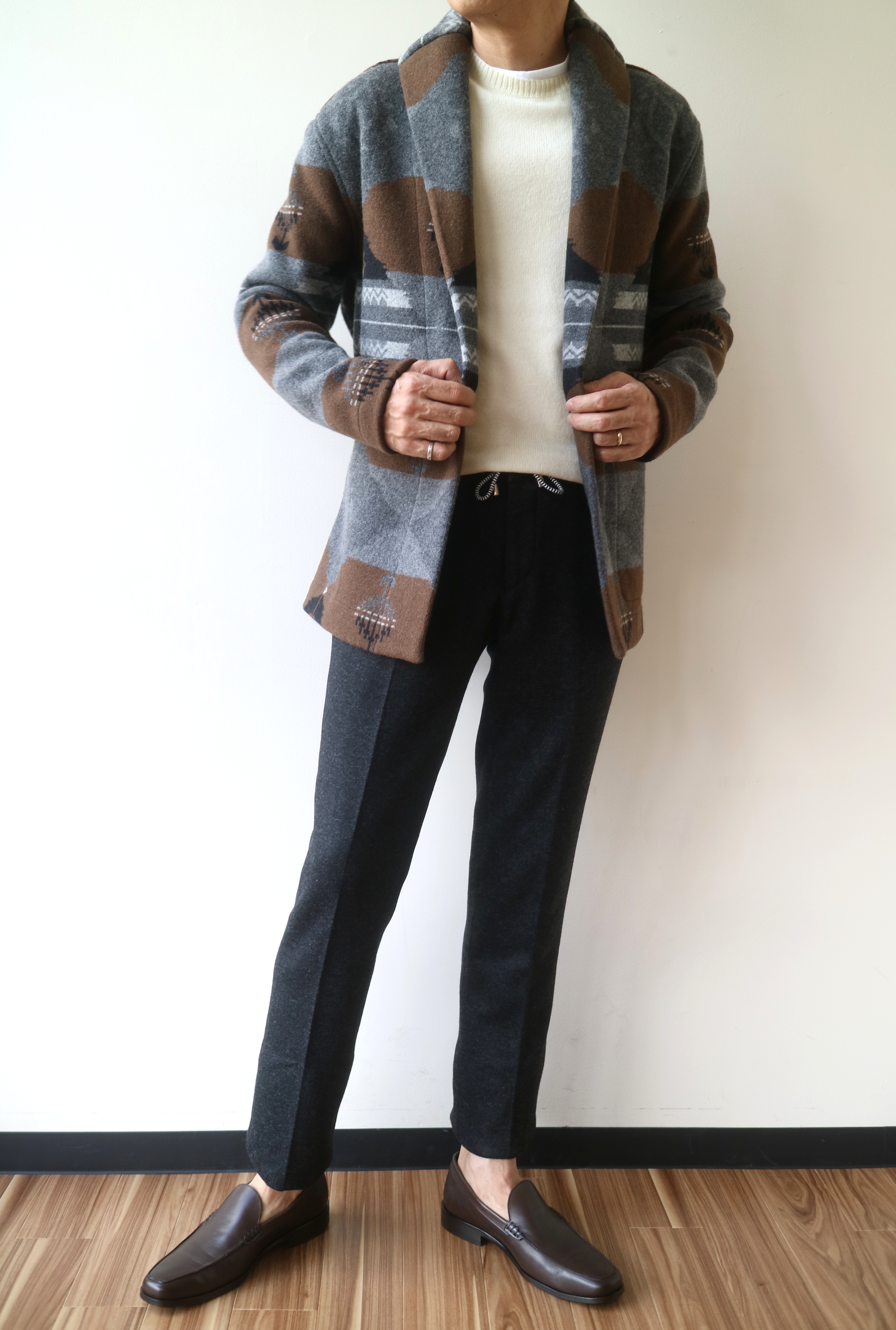 チャコールグレイで合わせたガウンジャケットはDREW&CO.、ニットはSCAGLIONE(未公開)、靴はParaboot。ネイビーで合わせたシャツは私物、靴はdiadora HERITAGEです。