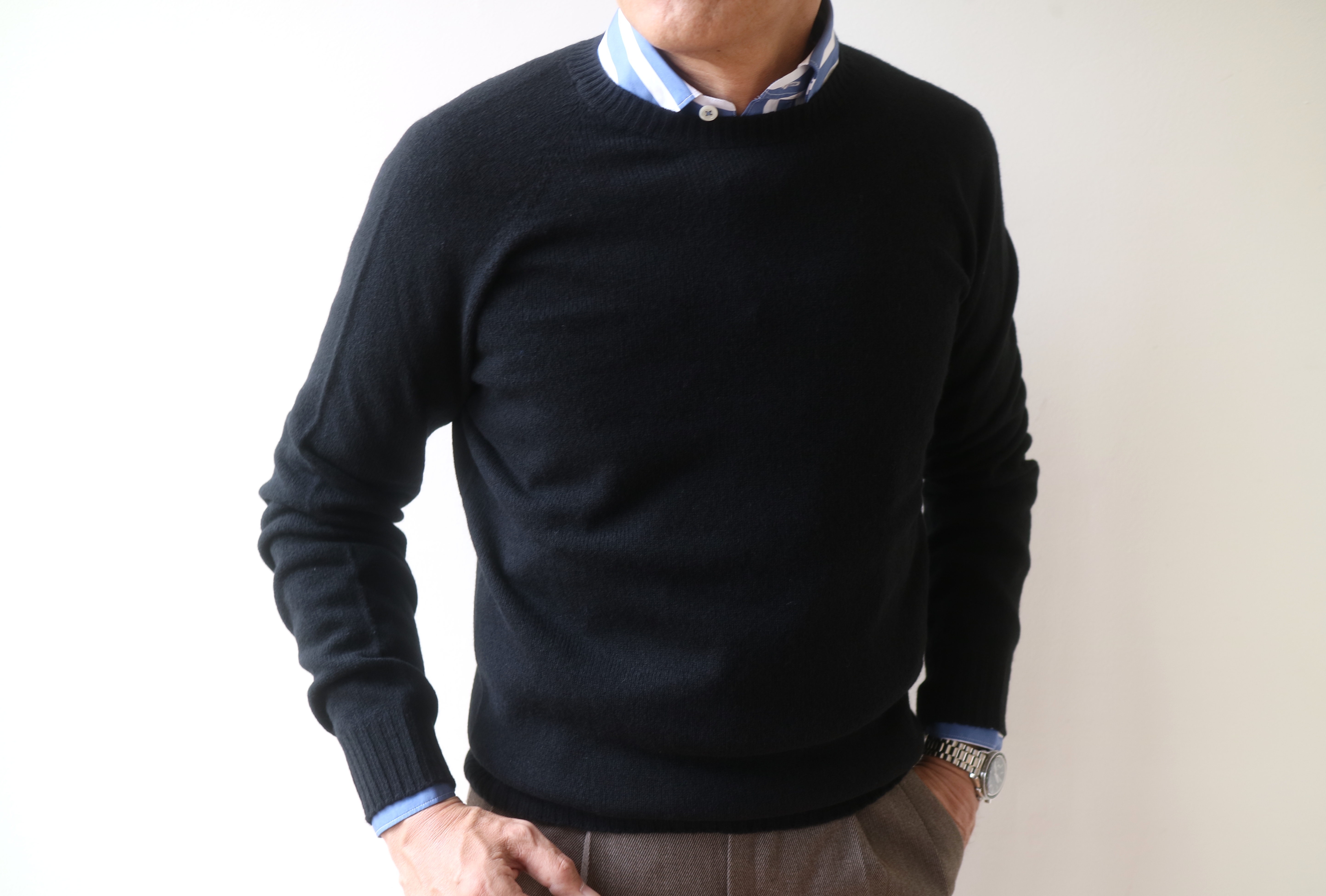 ふんわり、ふわふわの天使のような?着心地を提案してくれる「air jumper」。ただ、こちらのクルーネックには、その表記がありません。そのソフトな手触りは、カシミア混ウールだから。袖付けもきれいなリンキングされたラグランスリーブ。衿ぐりや袖口、裾もシングルのリブ編みで、最もベーシックで着まわしの良いクルーネックセーターに仕上がっています。