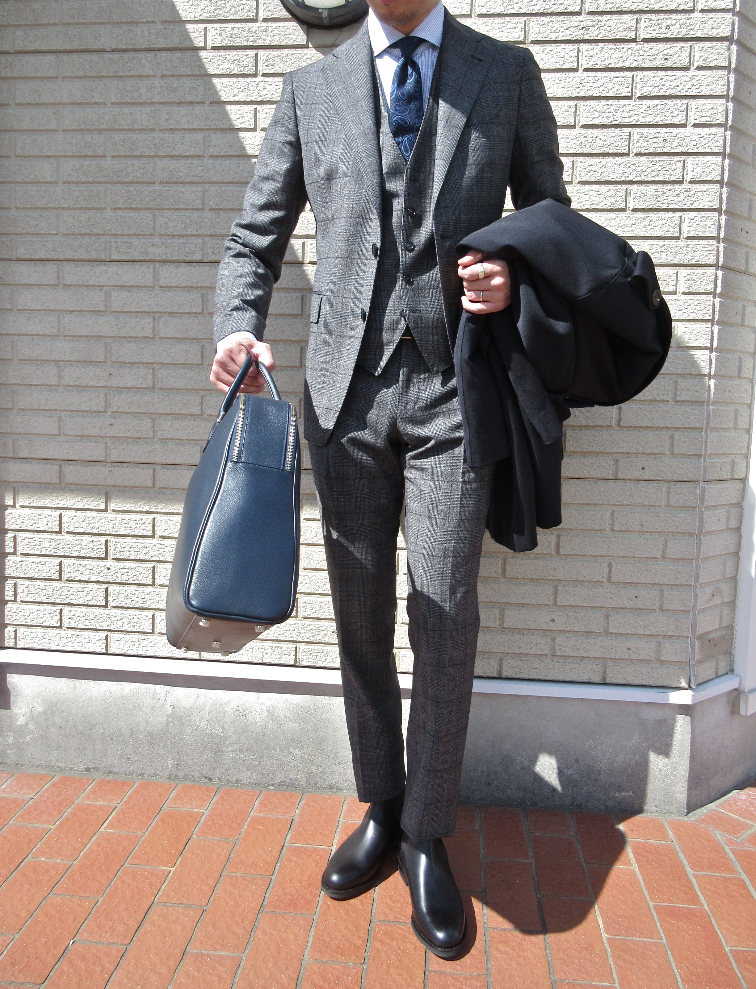 合わせたニットはCruciani(未公開)、パンツはINCOTEX、手に持ったバッグはCISEI、靴はParabootです。