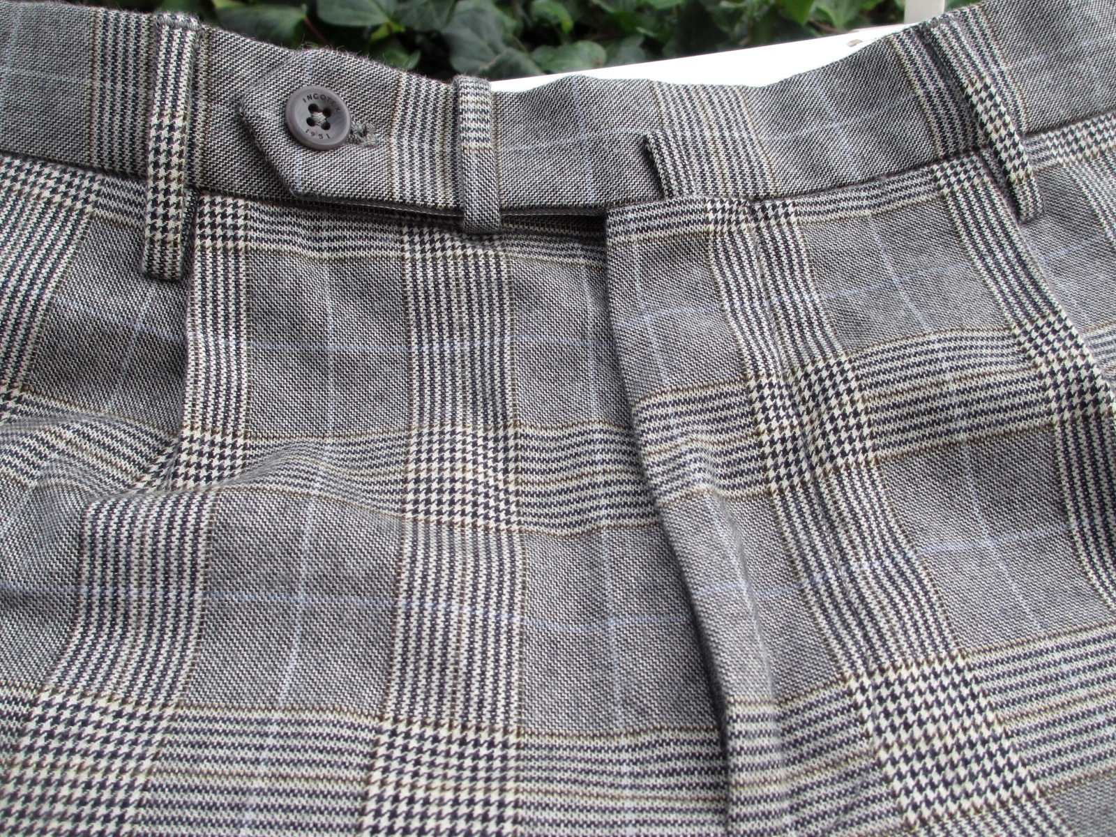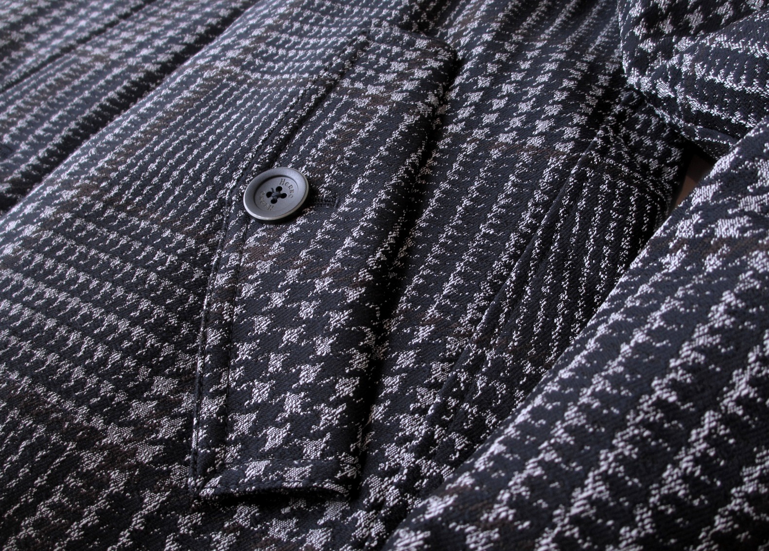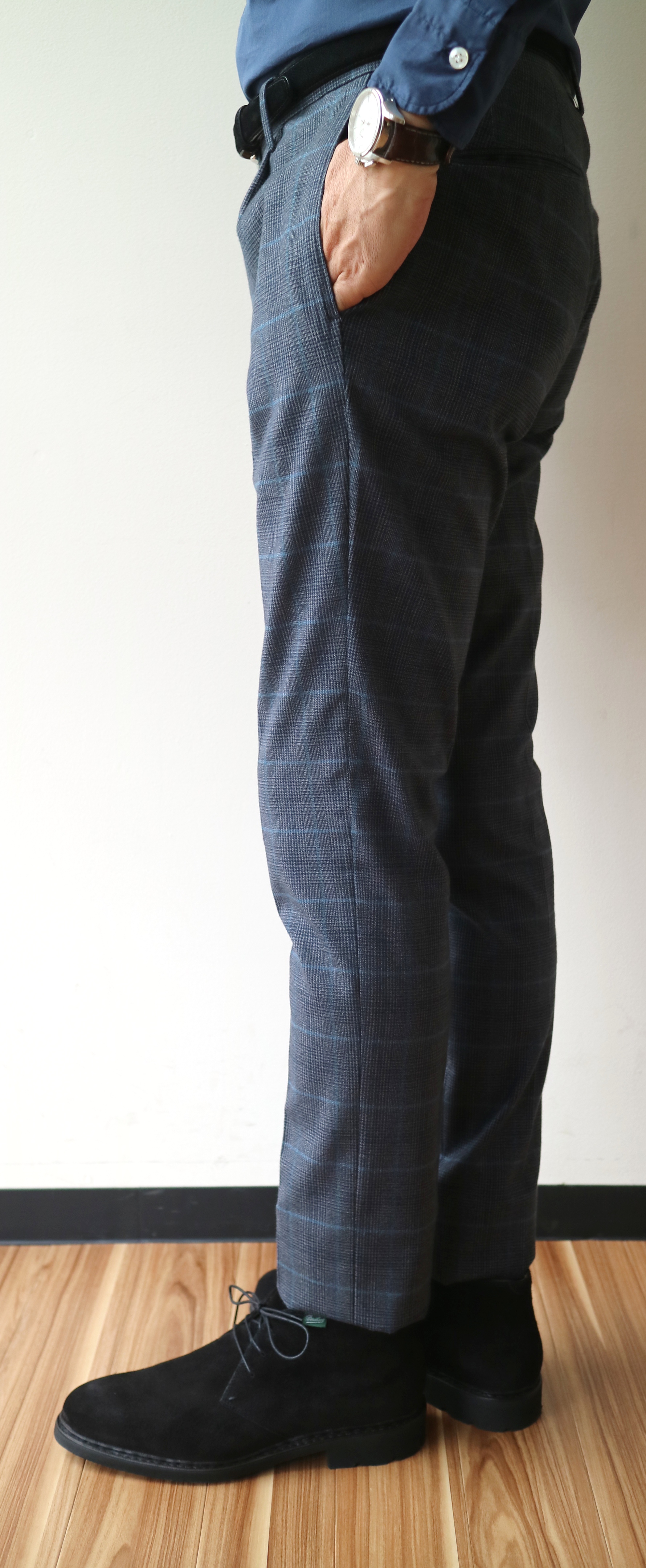 グレンチェック柄は、ウールに見せて実はコットンストレッチ。触れば、ピーチスキンのような柔らかさを感じます。ヌメリ感とでも言うのでしょうか。ドレス顔のカジャアルパンツ。気楽な素材のドレスパンツ、どちらの表現も当てはまります。