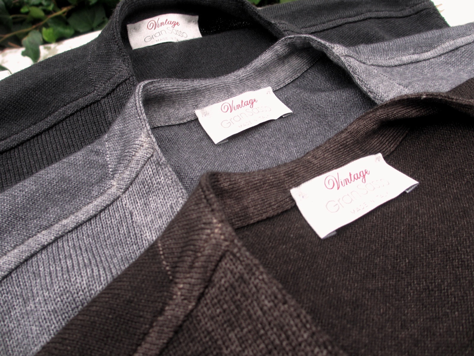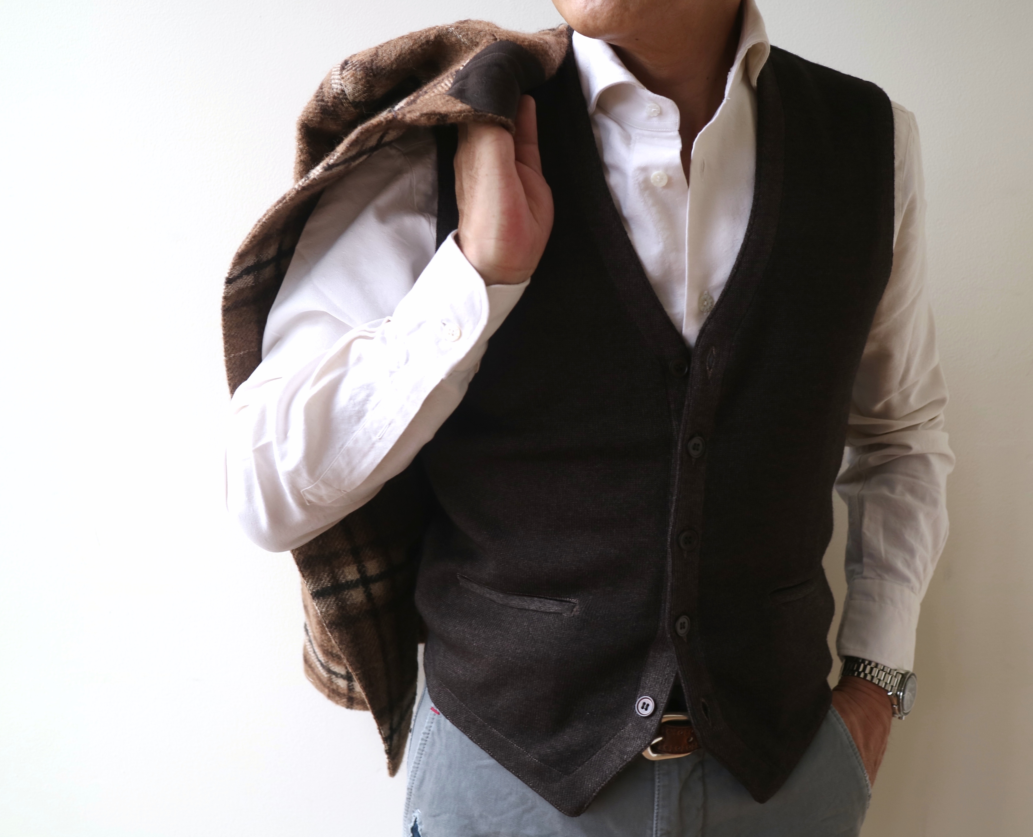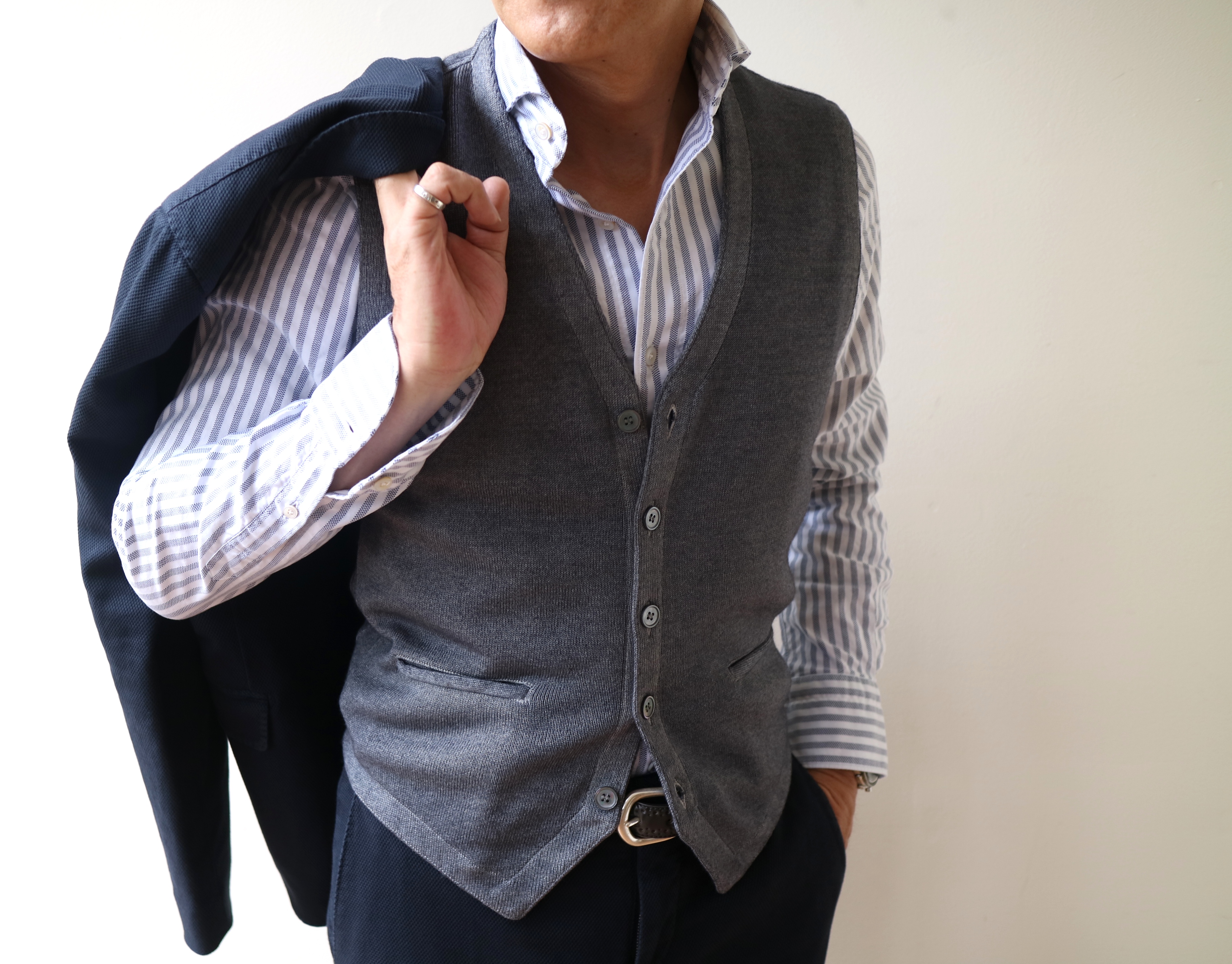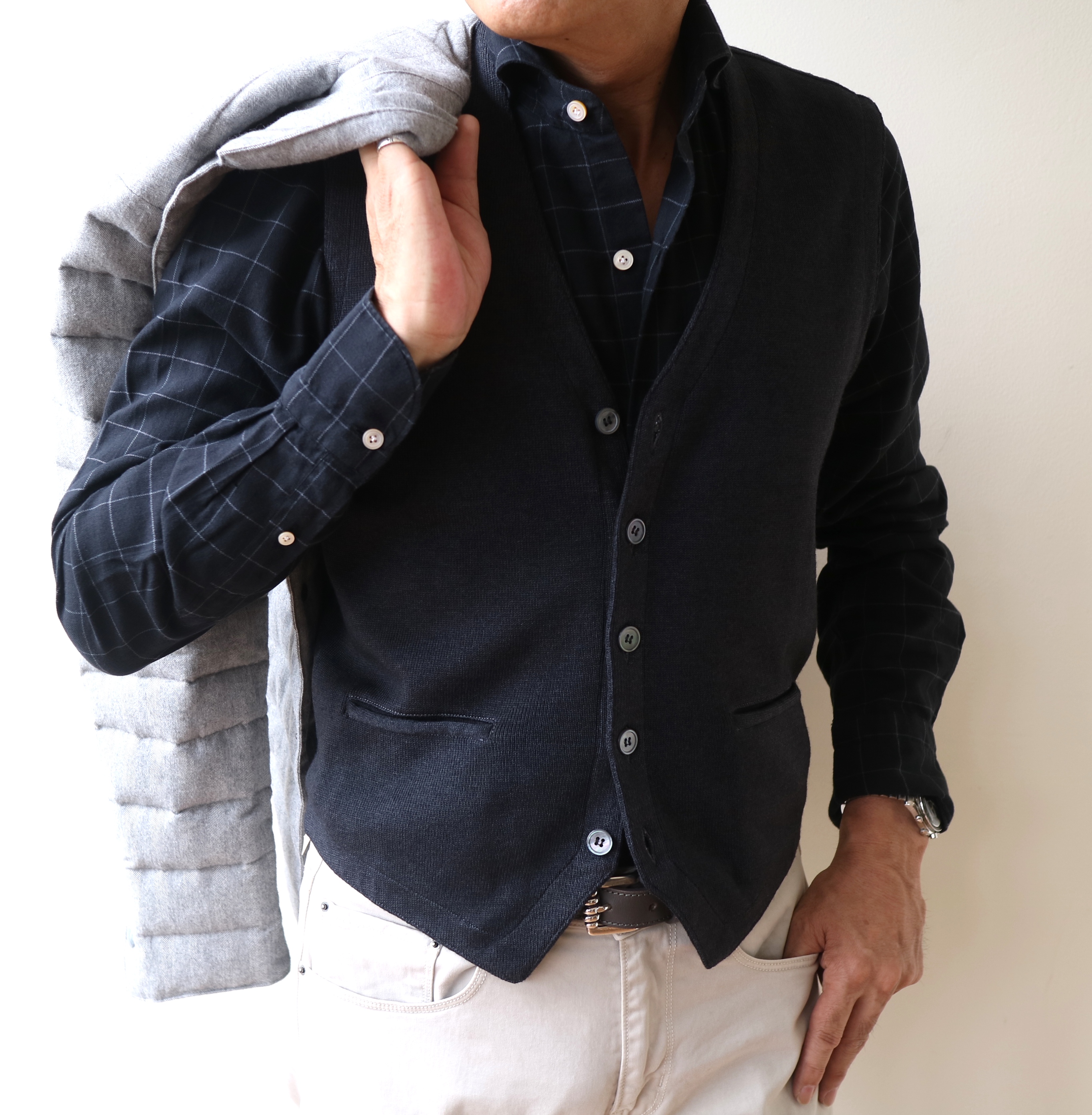 最後にニットのジレです。ドレス以外にもラフに着こなせるようにと、ガーメントダイ加工でセレクトです。温度調整だけではなく、コーディネートのアクセントとして活躍。着用シーズンも長く、様々なシーンで活躍するアイテムです。無理やりこじつけるなら、裾がリブ編みではなく、V字にカットされたオッドベストタイプが、お茶目です。