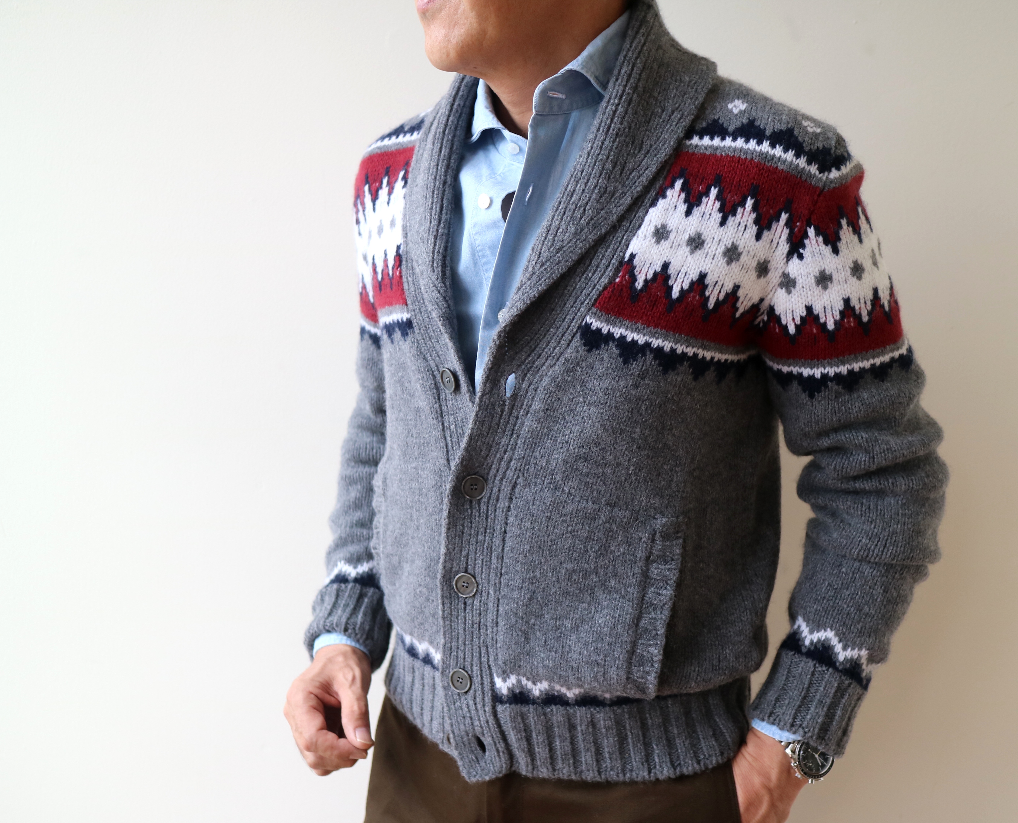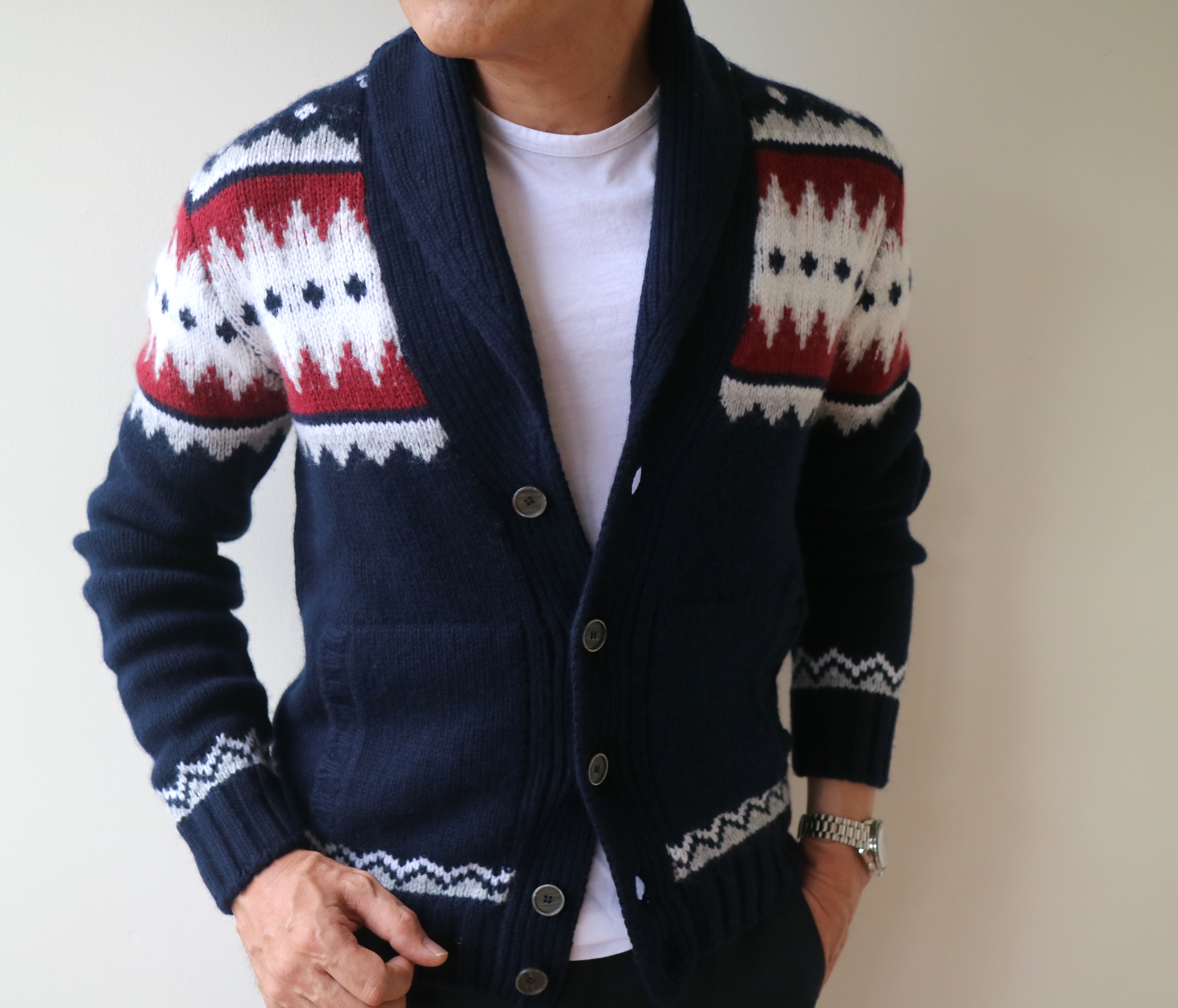 メインコレクションで見つけたのは、ショールカラーのカウチンカーディガン。こんなの欲しかった!!と思わず叫んではいませんが、「シメた」と思ったのは事実。こんなカーディガンはクールなスーツ姿とのギャップを楽しみ、いつもと違う、少年のような自分をアピールするのには打ってつけのアイテムなんです。どこでアピールするかは、人それぞれです。
