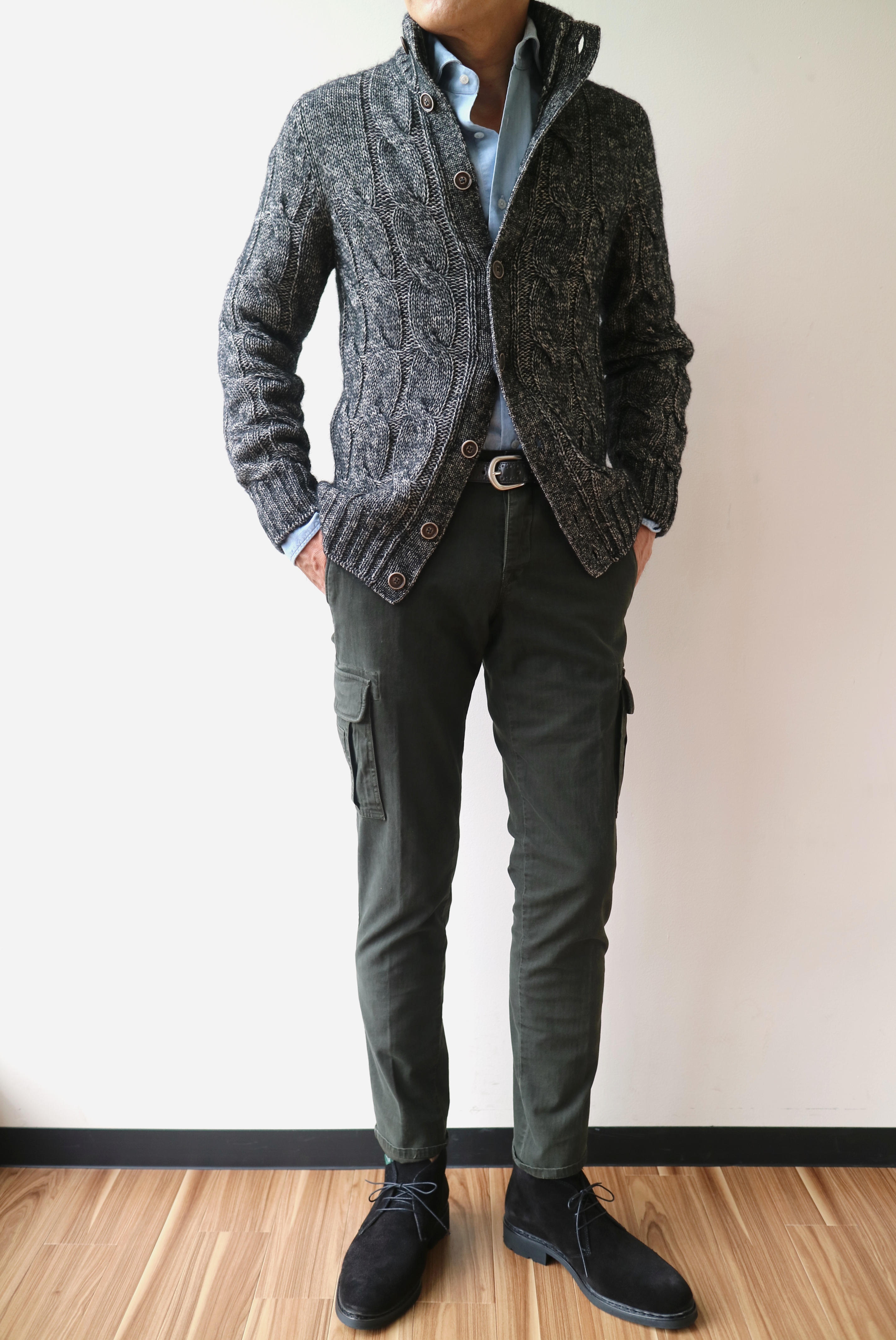 軍用カーゴをベースに作られた、ミリタリーテースト溢れるパンツは、カーキグリーンの地柄入りです。細身のテーパードシルエットですが、いつものストレッチの効いたスリムフィット。ロングカーデとの相性は抜群でした。