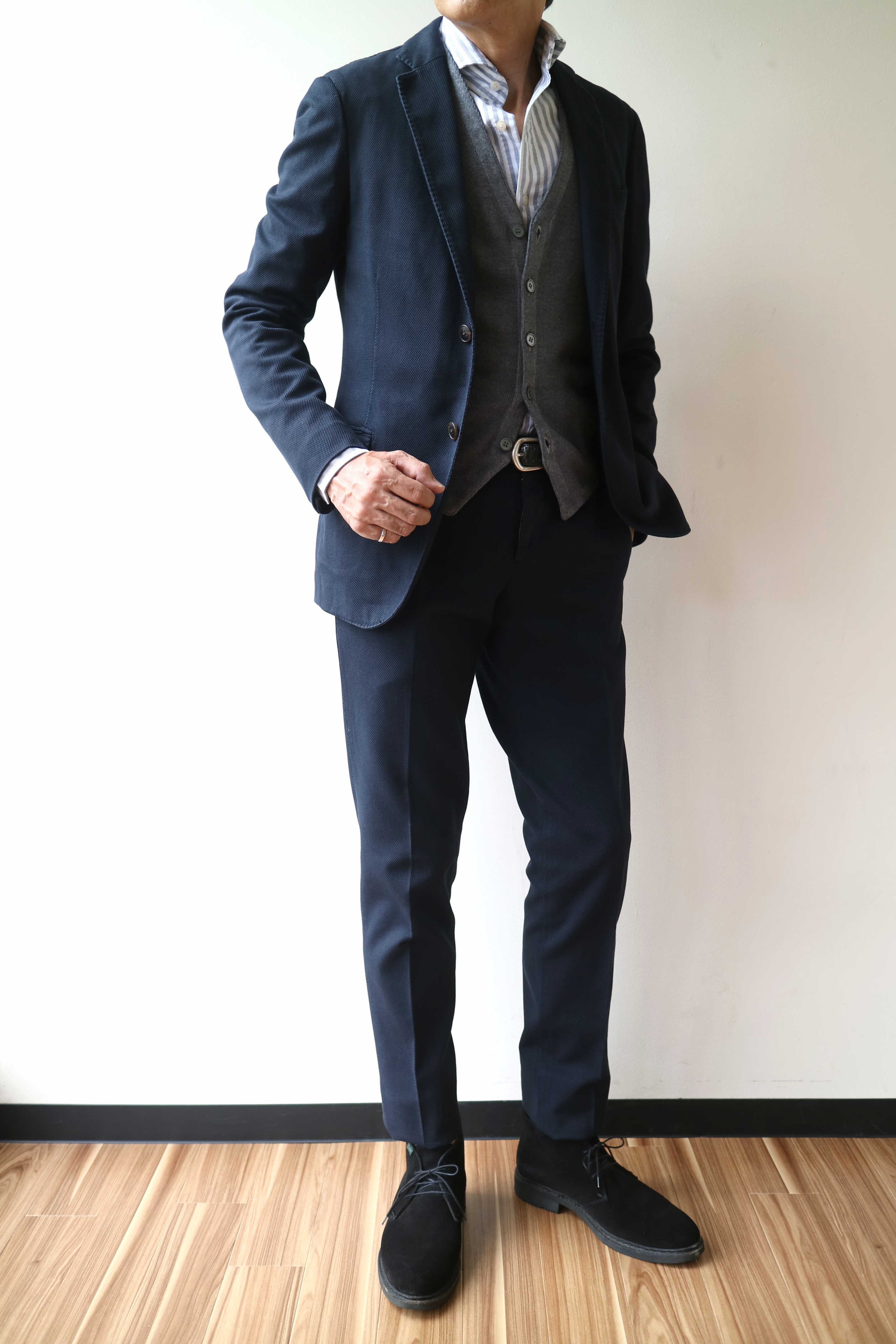 BOGLIOLI MILANO(ボリオリ ミラノ)のコットンガーメントダイ加工ネイビースーツにFinamore(フィナモレ)のオックスフォードロンドンストライプ柄シャツに、ベルトはTIBERIO FERRETTI(ティベリオ・フェレッティ) 靴はParaboot(パラブーツ)のスエードチャッカブーツを合わせています。
