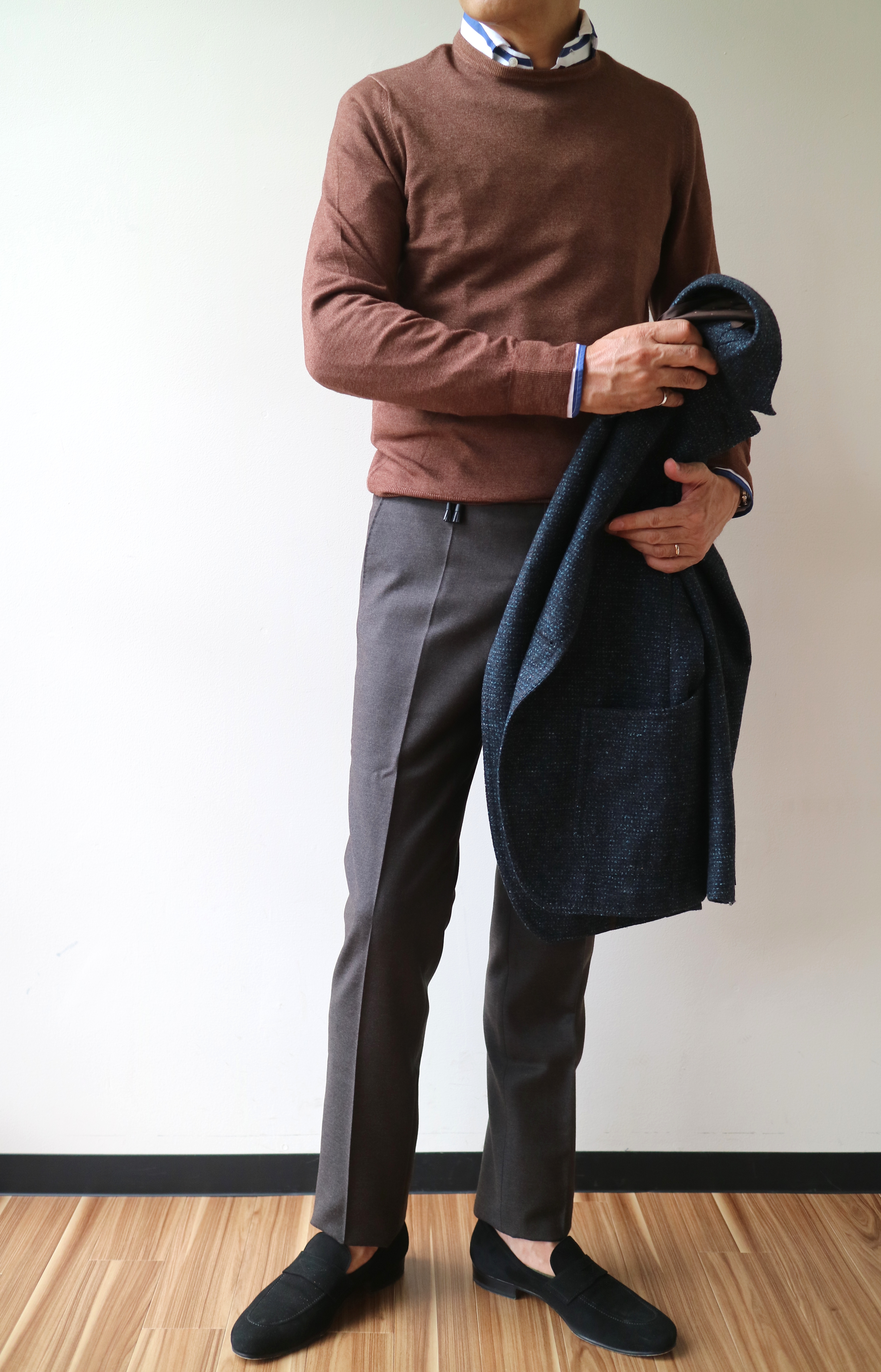 ガーネットで合わせたジャケットはISAIA(明日予定)、JOHN SMEDLEY(近日予定)、パンツはINCOTEX、靴はFERRANTE。ネイビーで合わせたニットはGran Sasso、パンツはINCOTEX、手に持ったジャケットはTAGLIATORE(近日予定)、靴は私物のFERRANTEです。ベルトはどちらもTIBERIO FERRETTIを使っています。