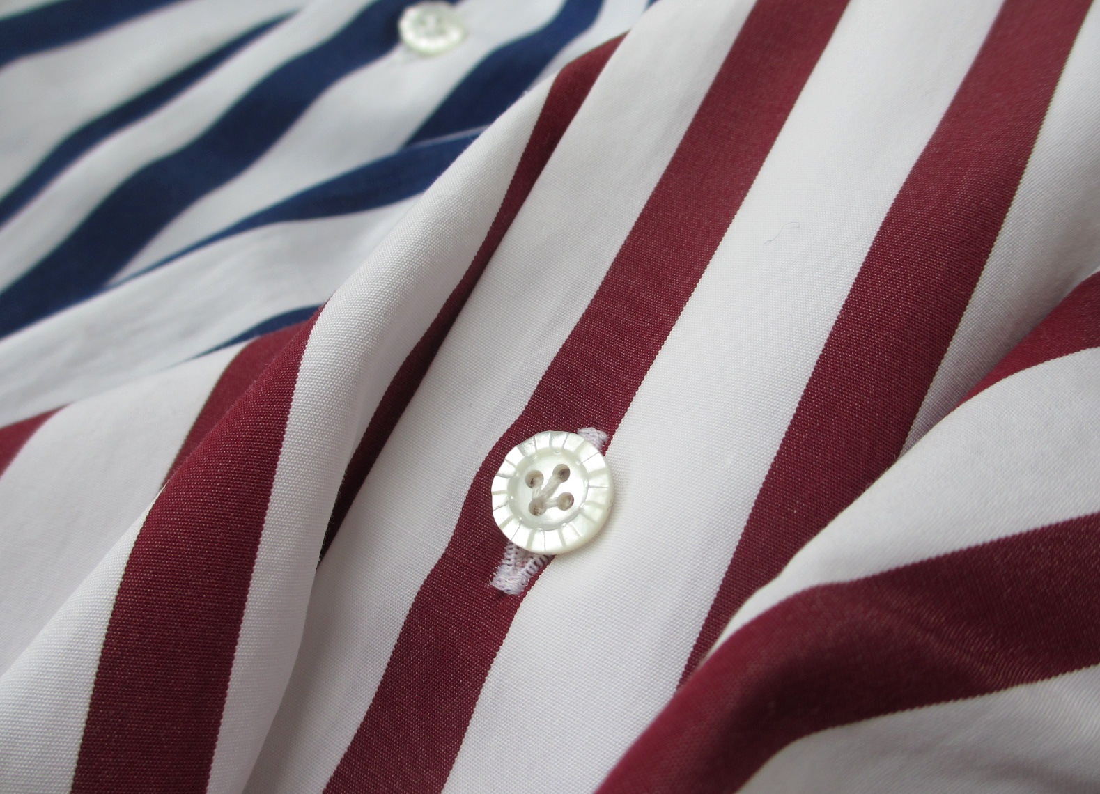 色1.0cm、白1.5cmのボールドストライプ。コットン100%のブロードクロスです。ボルドーほど赤みのないガーネット(海老茶)とネイビーでセレクトです。