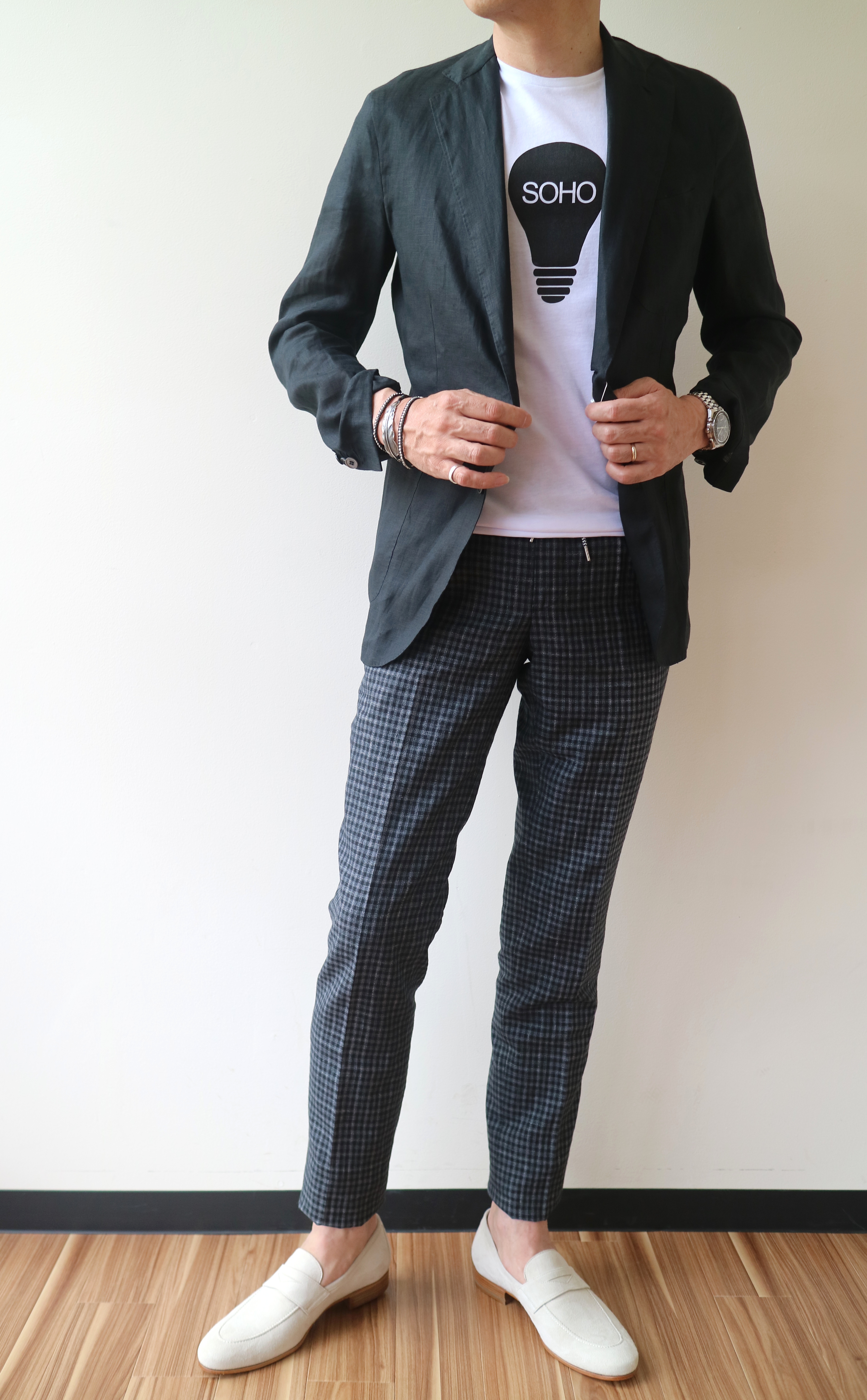全身コーディで合わせたジャケットはMario Muscariello、パンツはVIGANO、靴はFERRANTEです。