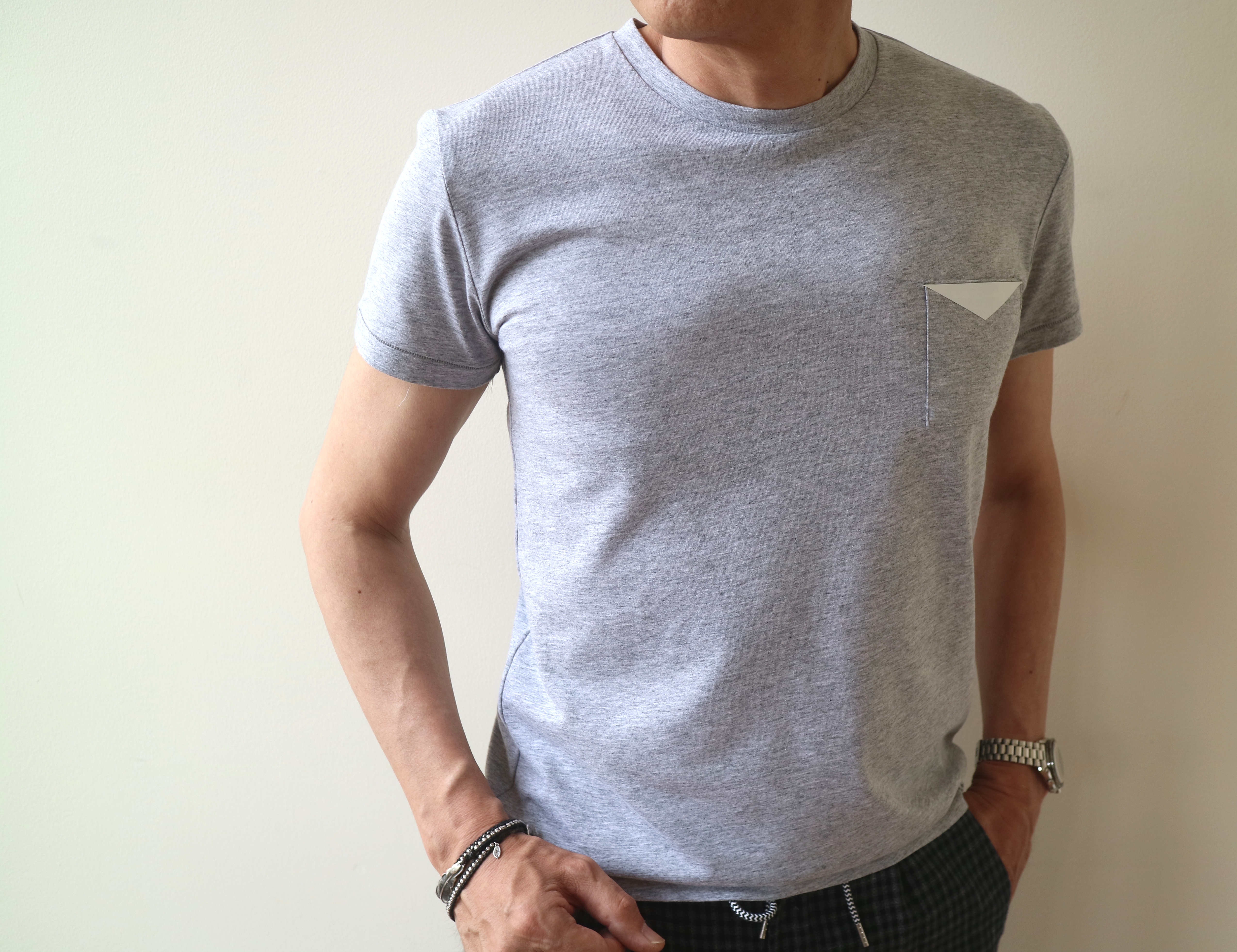 セレクトの中では最もシンプルなTシャツですが、唯一のポケット付。トライアングルのプリントが入るだけで、こんなにもモダンに仕上がりました。デザインの妙ですね。