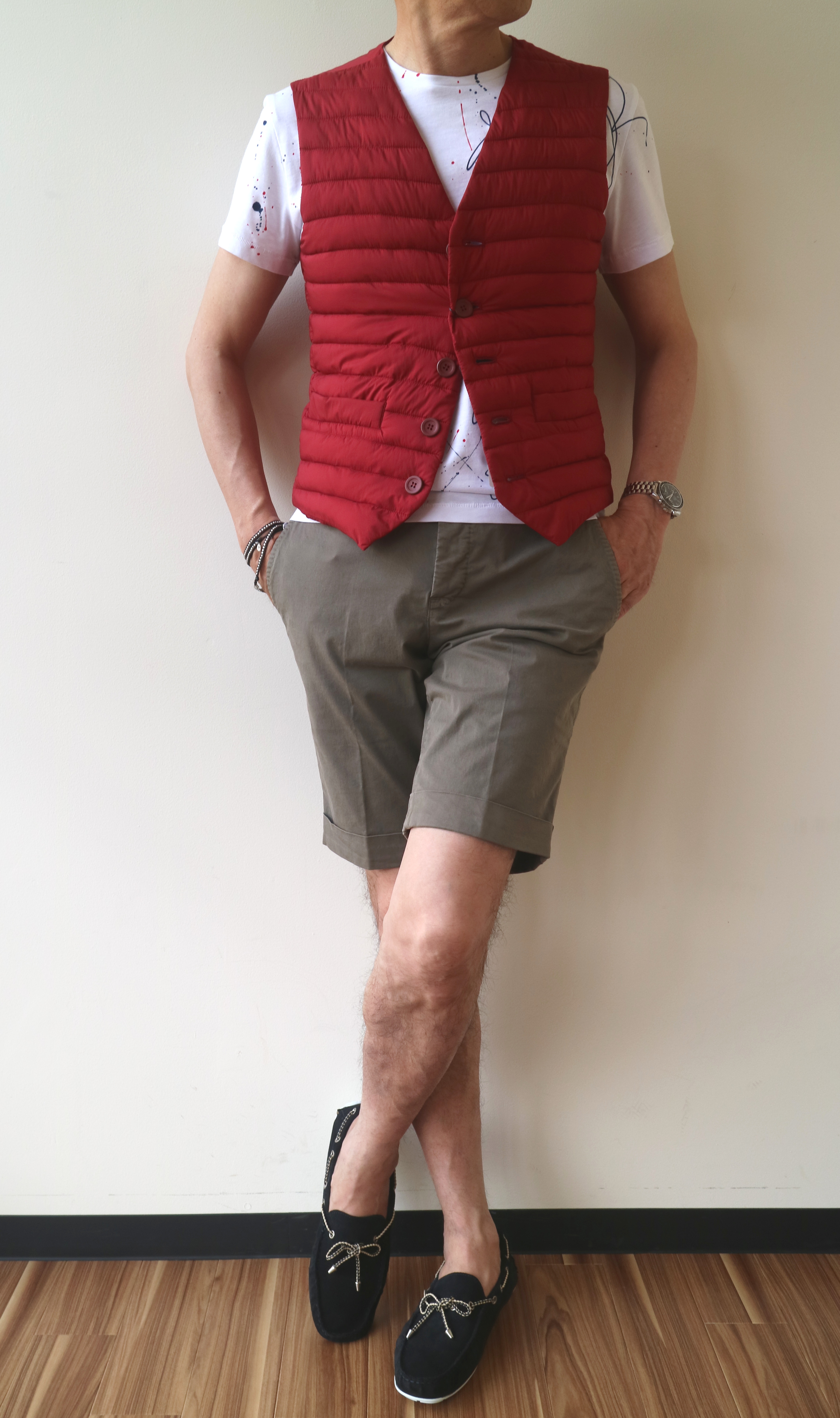 全身コーディで合わせたダウンベストはHERNO、ショーツはPT01、靴はONLY ONE(マガジーノ)です。