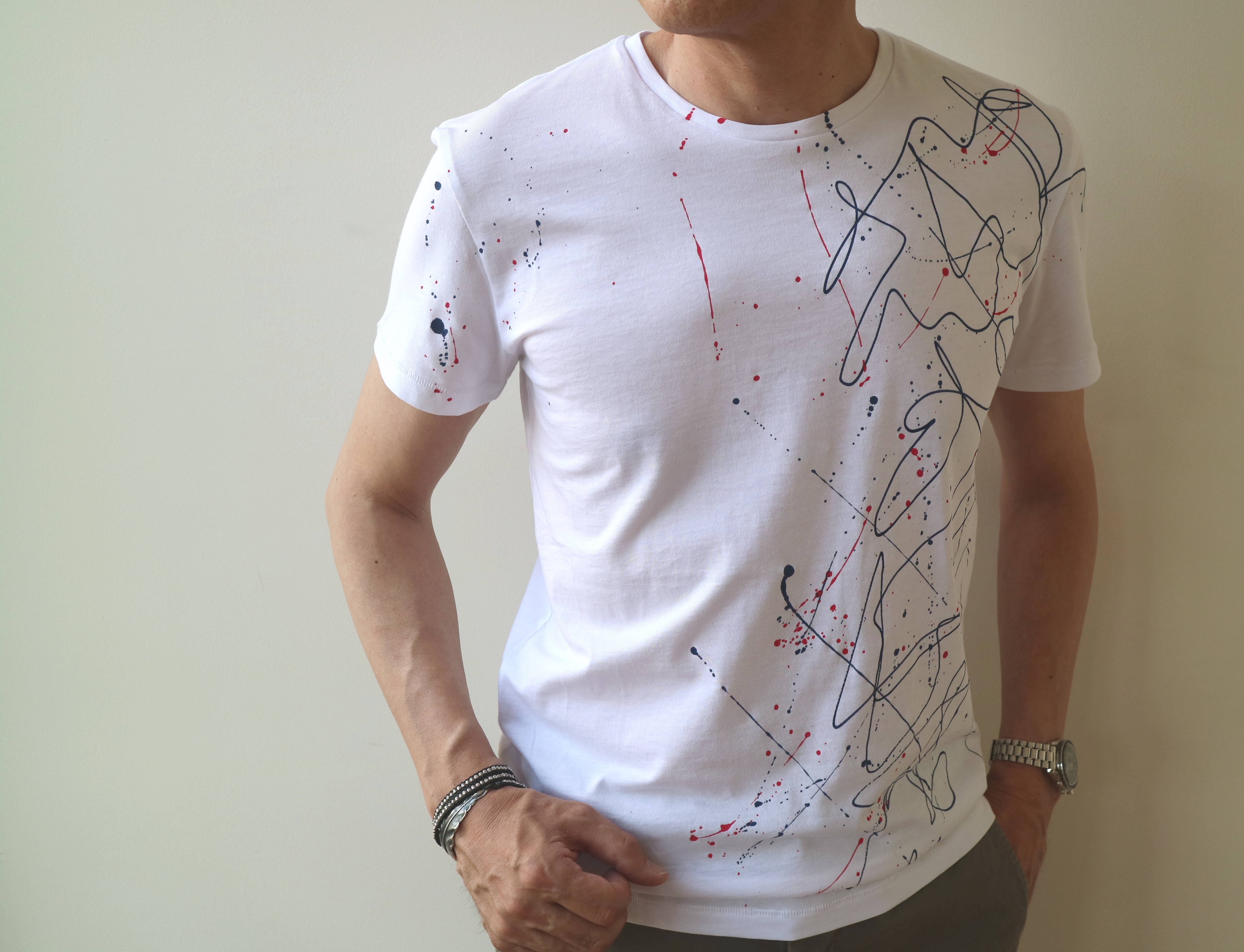 展示会で最も目を引いたのが、この無造作にペイントされたTシャツ。無地にもボーダーにもない、計算されつつも自由で空想的なデザインが魅力です。