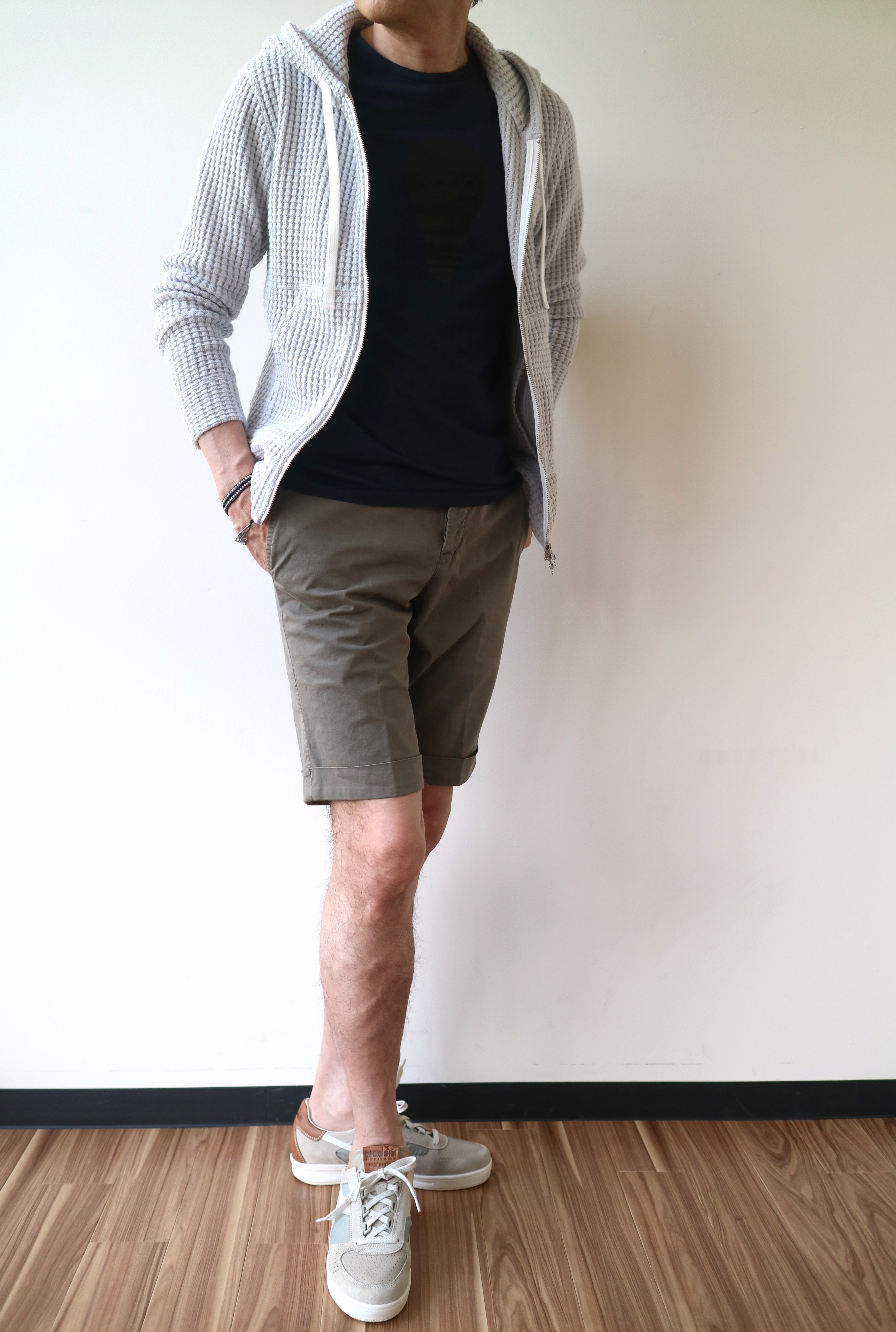 全身コーディで合わせたパーカーはSeagreen(マガジーノ)、ショーツはPT01、靴はDIADORAです。