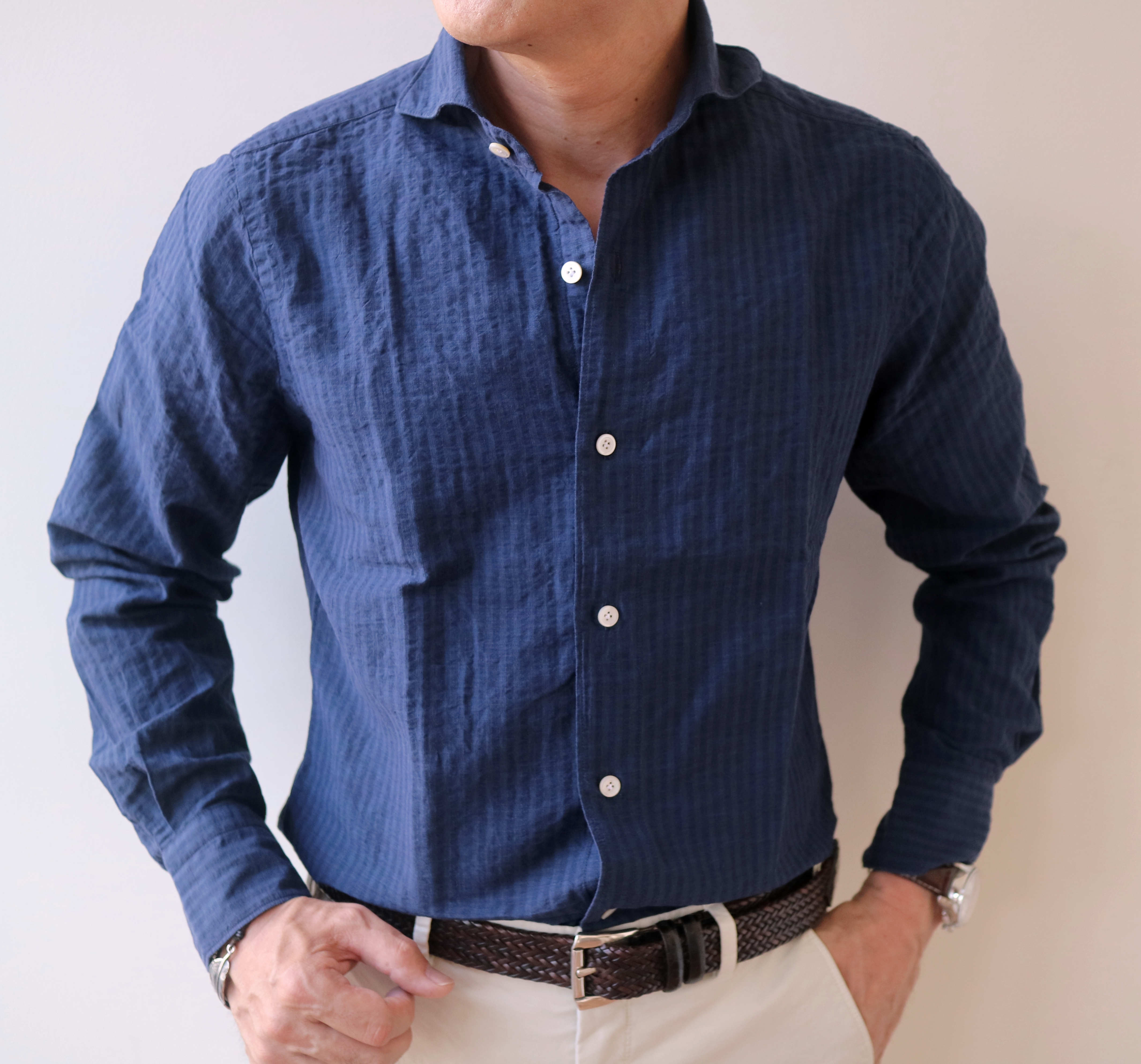 コットン70%にリネン30%と、リネンの混率が少なくても、あのドライなシャリ感は変わりません。リネンの特質は既に何度もご説明させていただいておりますので省略しますが、火照った体を冷やしてくれるには、リネンの力を借りるのが一番です。ネイビーにシャドーのストライプ柄が入り、凹凸感のある表情はシアサッカーにも似ています。もちろん、肩付け、釦付け、そしてガゼットの3箇所ハンドが軽い着心地をさらに加速させてくれます。