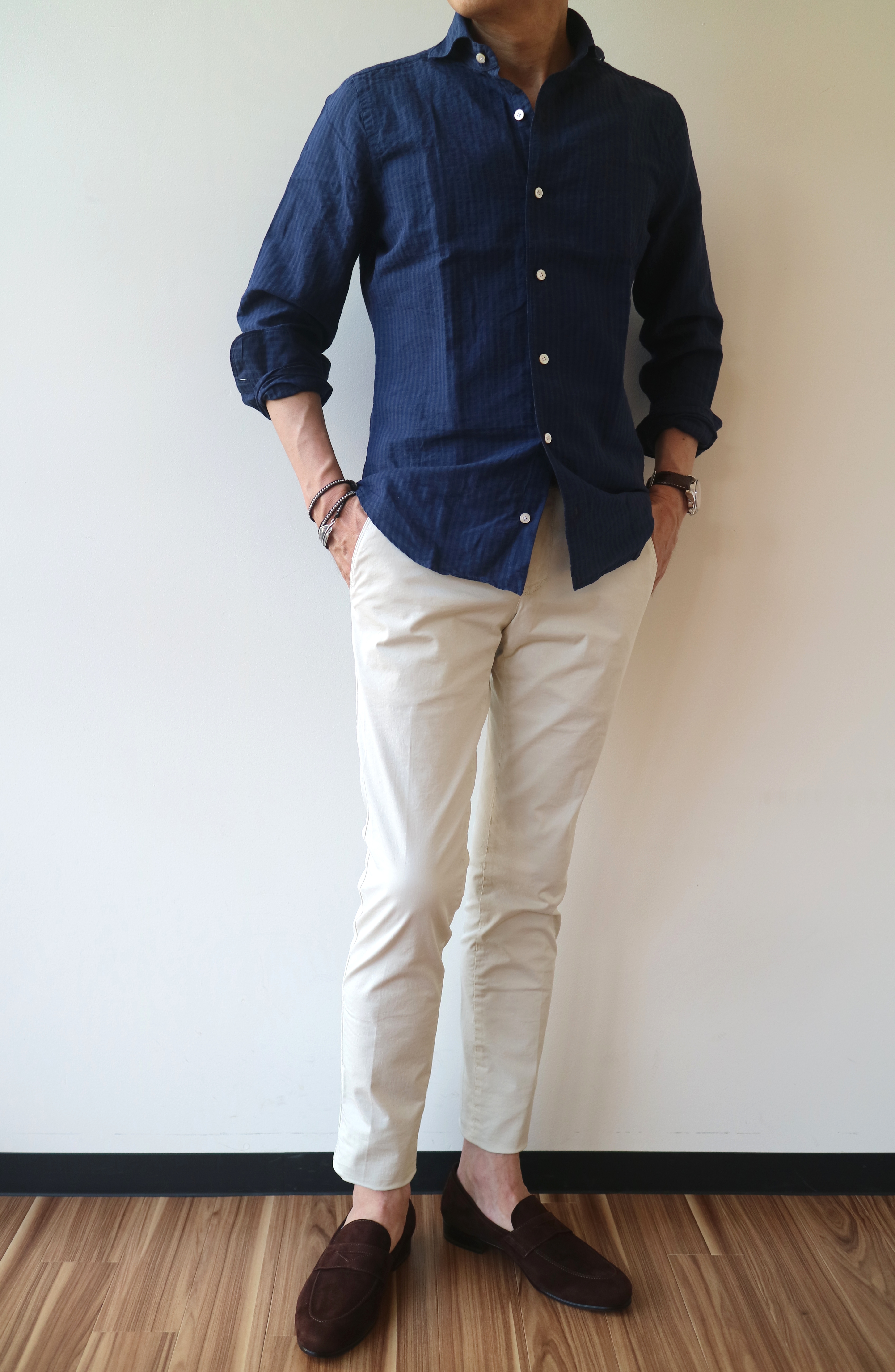 昨夜、ご案内させていただいたSIVIGLIA(シヴィリア)のパンツ。その際にも着ていました。カットソーでは表現できないエレガントさがシャツにはあります。アンコンなどのイージージャケットやニット、カットソーのジャケットにリネンのシャツは、最も提案したい夏のスタイルです。