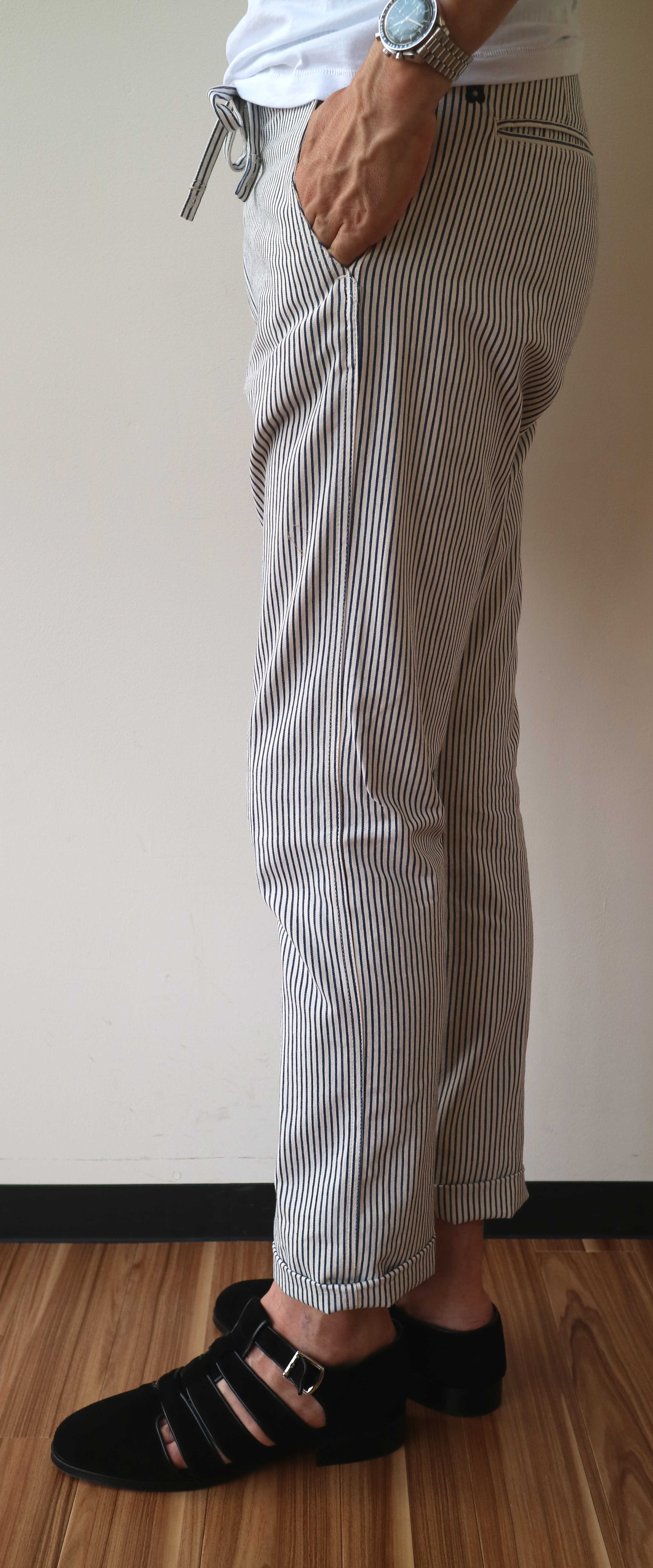 MODEL:「WHY NOT」 ドローコード付きヒッコリーストライプパンツ