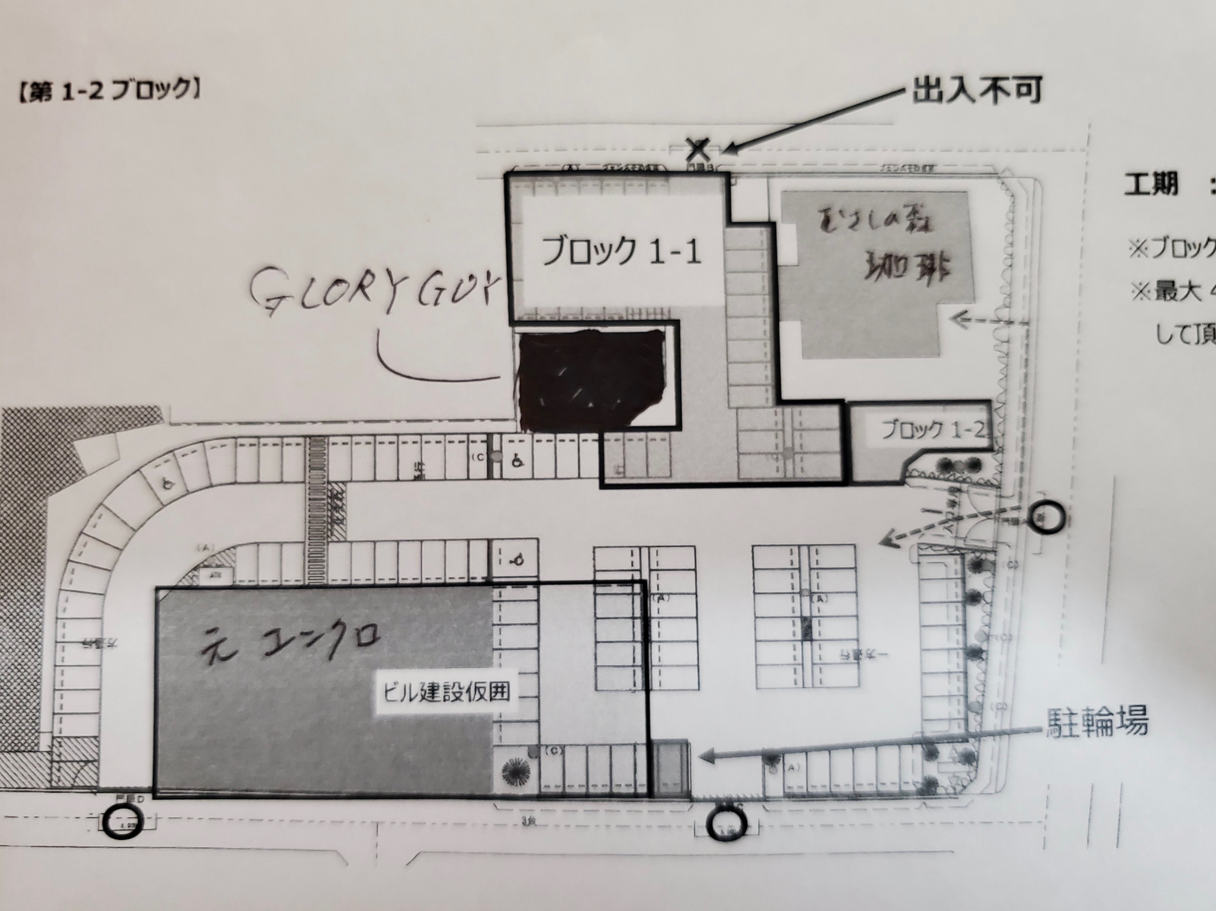 期間中は、スーパードミーさん側の入り口は使えません。正面と東側の出入り口をご利用ください。また、現在、グローリーガイ店舗裏側にご用意させて頂いた専用駐車場も工事のため、正面ウィンドウ前に移ります。車止めにブロックやカラーコーンを置いて表示させて頂きますので、こちらをお使いください。この場所をさらに活性させていく工事です。しばらくの間ご不便をおかけしますが、ご了承くださいますようお願い申し上げます。