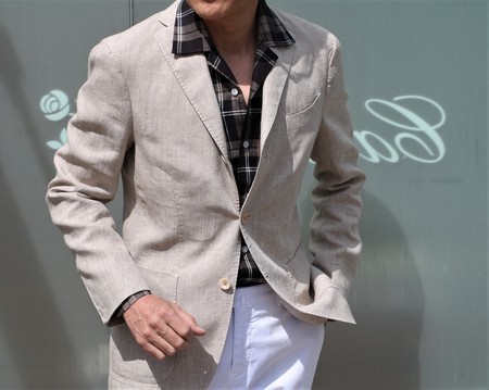 そんな当時のクラシック喫茶を思い出しながら、こんなジャケットが似合うんじゃないかなと取り出したのが、【BOGLIOLI/ボリオリ】の「亜麻色リネンジャケット」。サンドベージュの夏らしい1着です。