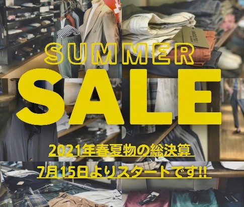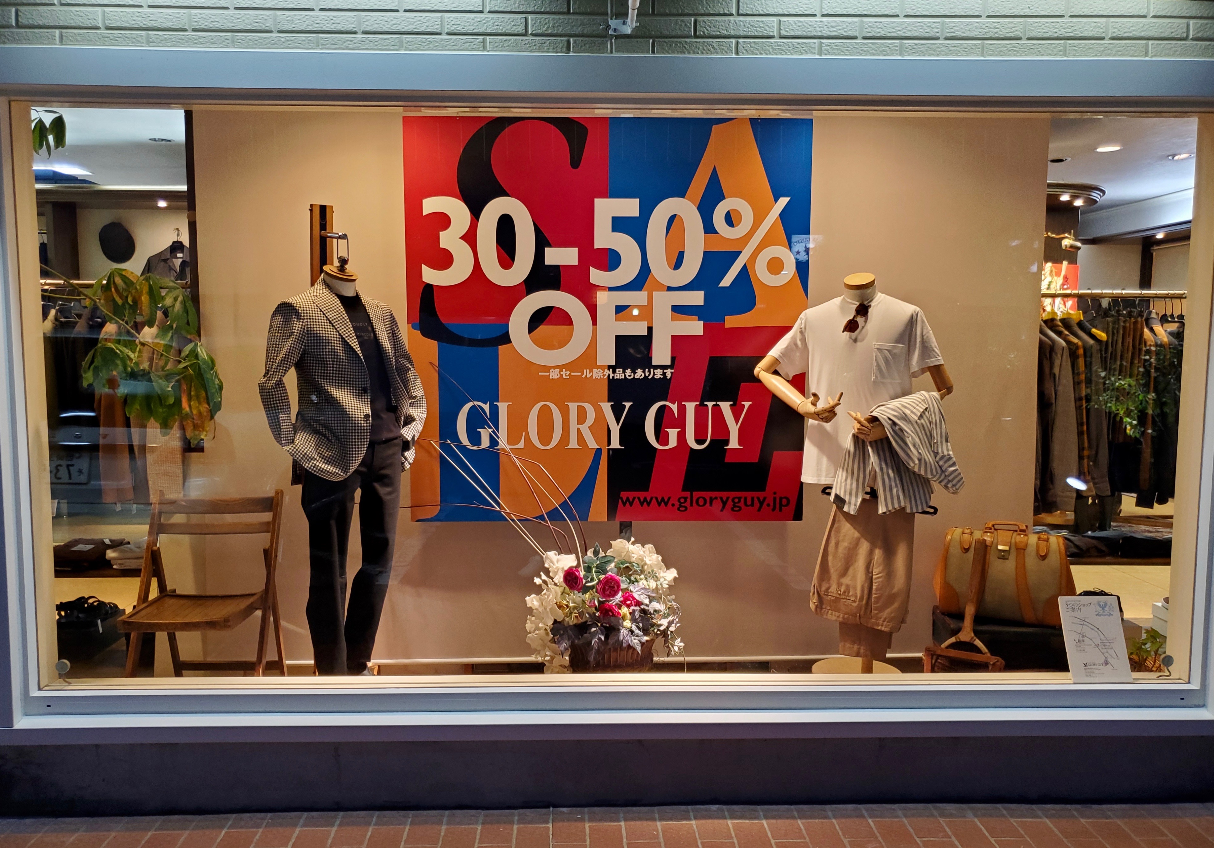 恒例のセール看板が、今最も目立つディスプレイとなっております。梅雨明けと同時スタートを狙っておりましたが、少しずれました。本格的な夏を快適に過ごしていただくために、心にも体にも優しい服をたくさんご用意しております。ぜひ、この機会にご利用ください。