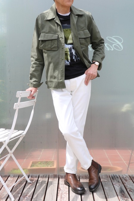 私物のFORTELA(フォルテラ)のホワイトデニムに羽織ったのは、同じくFORTELA(フォルテラ)のカバーオールと、ちょっぴりワークな雰囲気で合わせたTシャツが、PAUL&SHARK(ポールアンドシャーク)のヨッティングプリントTシャツ。