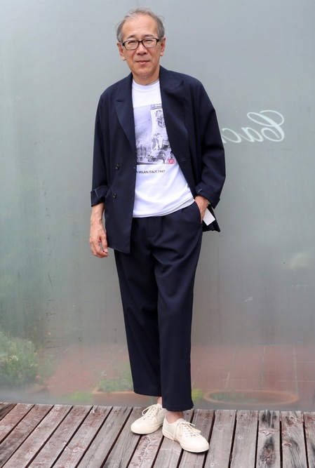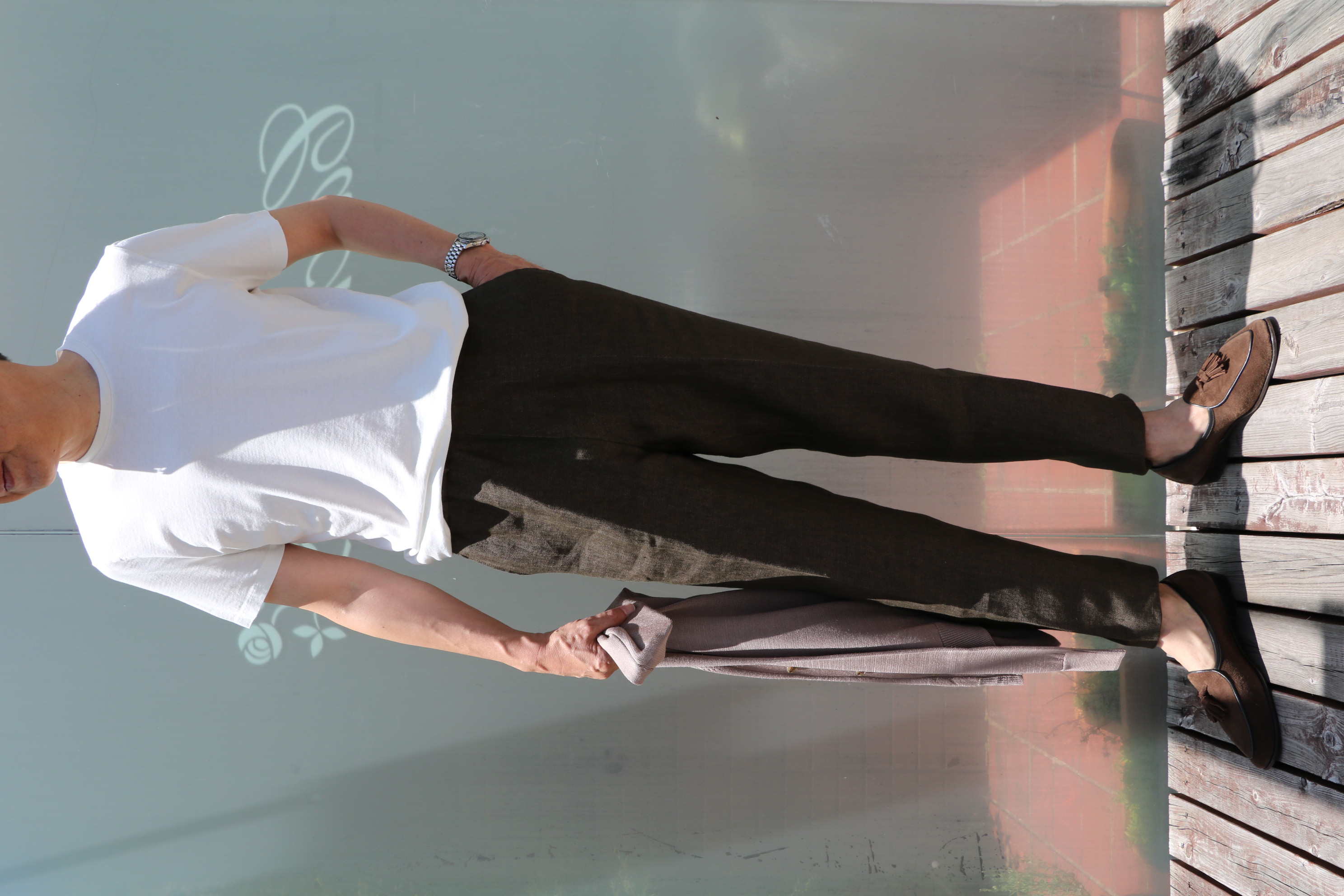 最後にナグラさんです。私物は靴だけと、勢い選んだBERWICH(ベルウィッチ)のパンツとDrumohr(ドルモア)のミラノリブニットジャケット。更にThe Bespoke Dudes(ザ ビスポーク デュード)のサングラスまでかけて、颯爽と登場。唖然としたのは、ジャケットを脱いで、HERNO(ヘルノ)のTシャツ一枚になった時。タックインしたTシャツの始末がダサいのです。裾にふんわり感が出ていません。多分、パンツに入れた後、大きく背伸びするのを忘れたのでしょうね。う〜ん、忘れただけならいいのですが...。聞くのが、怖くて、ブログで指摘だけしておくことにします。
