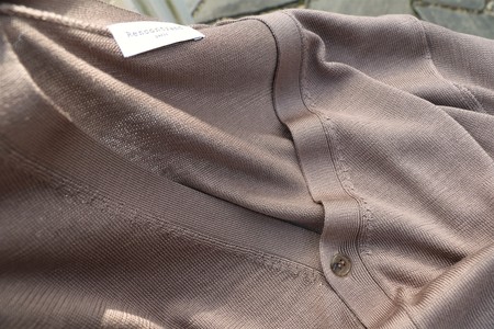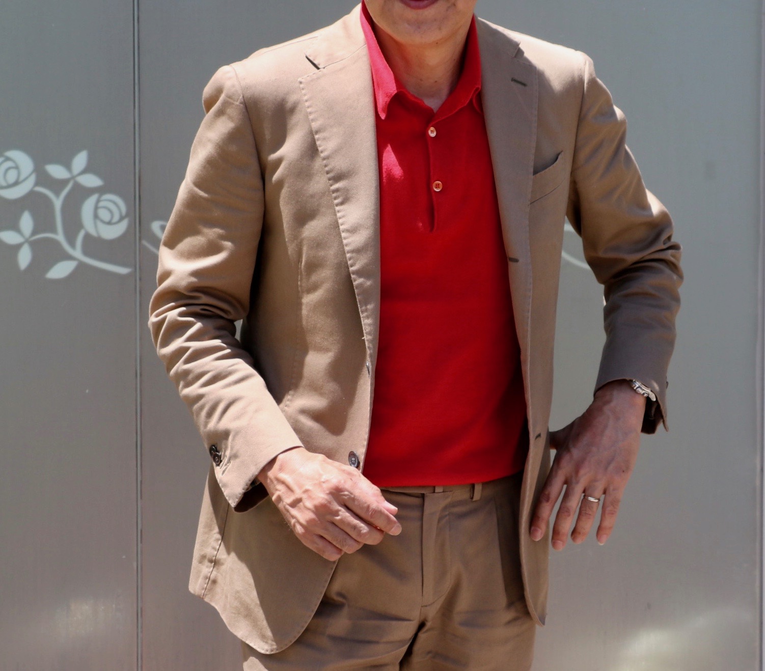 還暦前に購入した赤のJOHN SMEDLEY(ジョンスメドレー)。赤はもともと好きな色で、バラクーターG9のレッドを購入したのも最近。ただ、合わせ方として、今まではベージュのコットンスーツに赤のポロニット合わせることはありませんでした。でも髪の毛が少なくなり、黒い髪が白くなり、シワも増えた今、この配色が似合うようになったんです。若い時にはできなかった組み合わせが、今できることも洋服の面白さでしょうか。