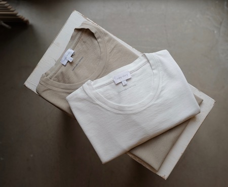 色と言い、素材感と言い、"ナチュラル""という言葉がぴったりのハーフスリーブのTシャツは、ドイツの【mey story/マイストーリー】。リネン・コットンの肌に凉を呼ぶ気持ちの良い着心地です。個人的にも愛用しているブランドで、リラックスウェアとして力を入れていきたいブランドでしたが、残念ながら次の展開がありません。本来なら、セール除外としていましたが、継続できないことで、今回、割引対象です。割引率も引き上げておりますので、ぜひご検討ください。