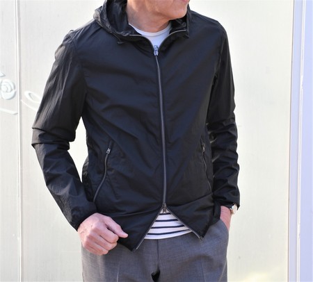 今日の天気とは裏腹の能天気な私の写真。外の景色も晴れなら、頭の中も晴れ。脳天気とも言います。羽織っているのは、HERNO(ヘルノ)の「タスラン加工ナイロン ミリタリージャケット」。ご案内は2月28日と、まだまだ冬物が手放せない時季でした。よく春のアウターやコートにスプリングをつけますが、どうもピンときません。早い時季なら、薄手の冬物に羽織ることもできるし、暖かくなれば、冬物の代わりに。今日のような雨降りの肌寒い日なら、ちょうど良い羽織物にもなります。でも、最もこの手のアウターが活躍するのは、夏の暑さが通り過ぎた秋風が吹く頃から北風が吹き出す頃まで。インナーを調整すれば、春、梅雨、秋のスリーシーズン。入荷時期が夏なら、スプリングではなくオータムと呼んで、ご提案しても良いはずです。そう思い、こんな雨の日にもう一度、見直してみることにしました。
