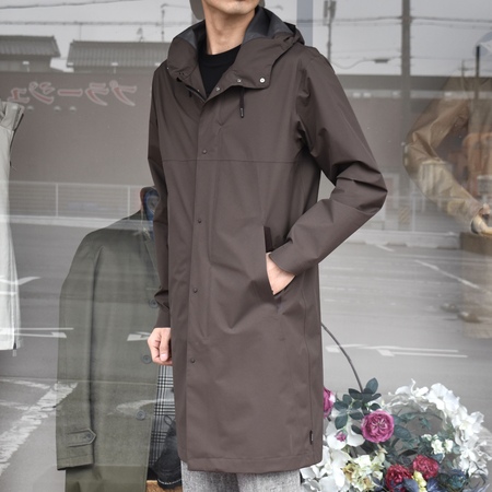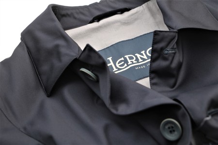 個人的に持っているヘルノの中では、最も長く愛用しているのが、こんなシンプルなステンカラーコート。もう10年近く、いや、それ以上着ているでしょうか。こんな雨の日にも大活躍です。ただ個人所有のものと異なるのは、素材。こちらは、