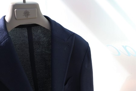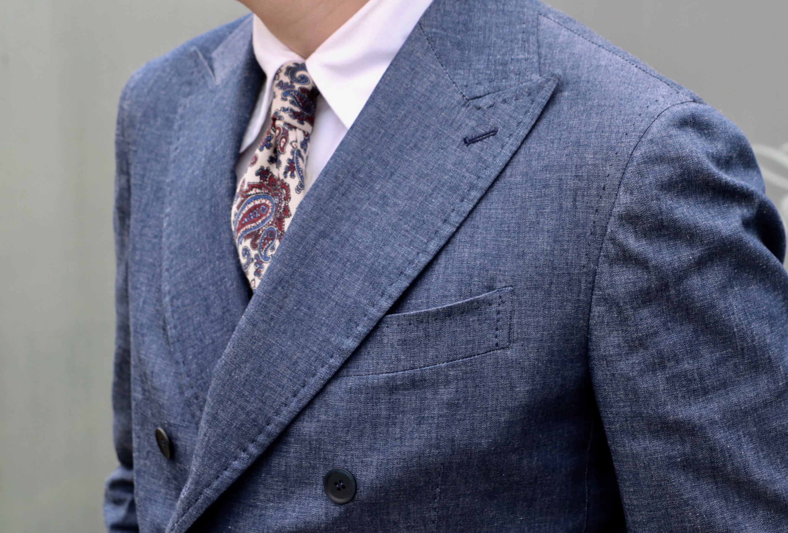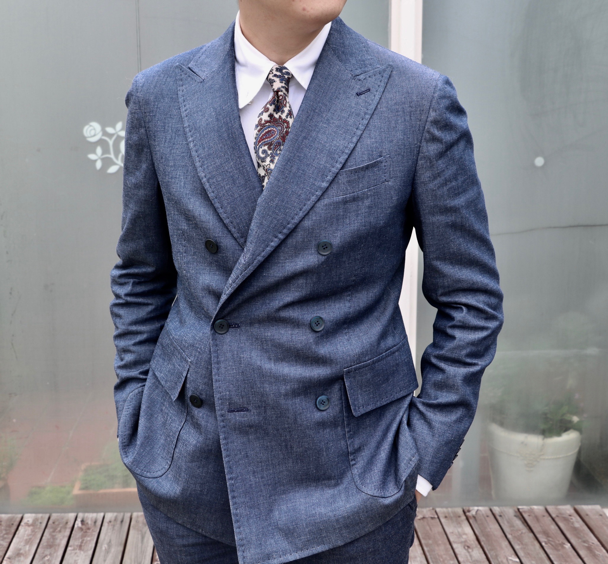 カシェート販売員のはずだったジュニアです。文句を言うわけにはいかず、ここは褒めるしかありません。特に彼の本日の出で立ちを見ればです。ついに購入かのStile Latino(スティレ ラティーノ)を着て、売り場に立っていると、なかなか堂に入っているのです。オーナー兼バイヤーの特権をフルに生かしてセレクトした「ストレッチデニム ダブルブレストスーツ」。昨年のブログでは自信満々の立ちポーズでご紹介し、さらにYouTubeにも取り上げた渾身のセレクトスーツだったのですが、たまげたことに似合わない。そこで、ここぞとばかり挑戦したのが、ジュニアだったのです。