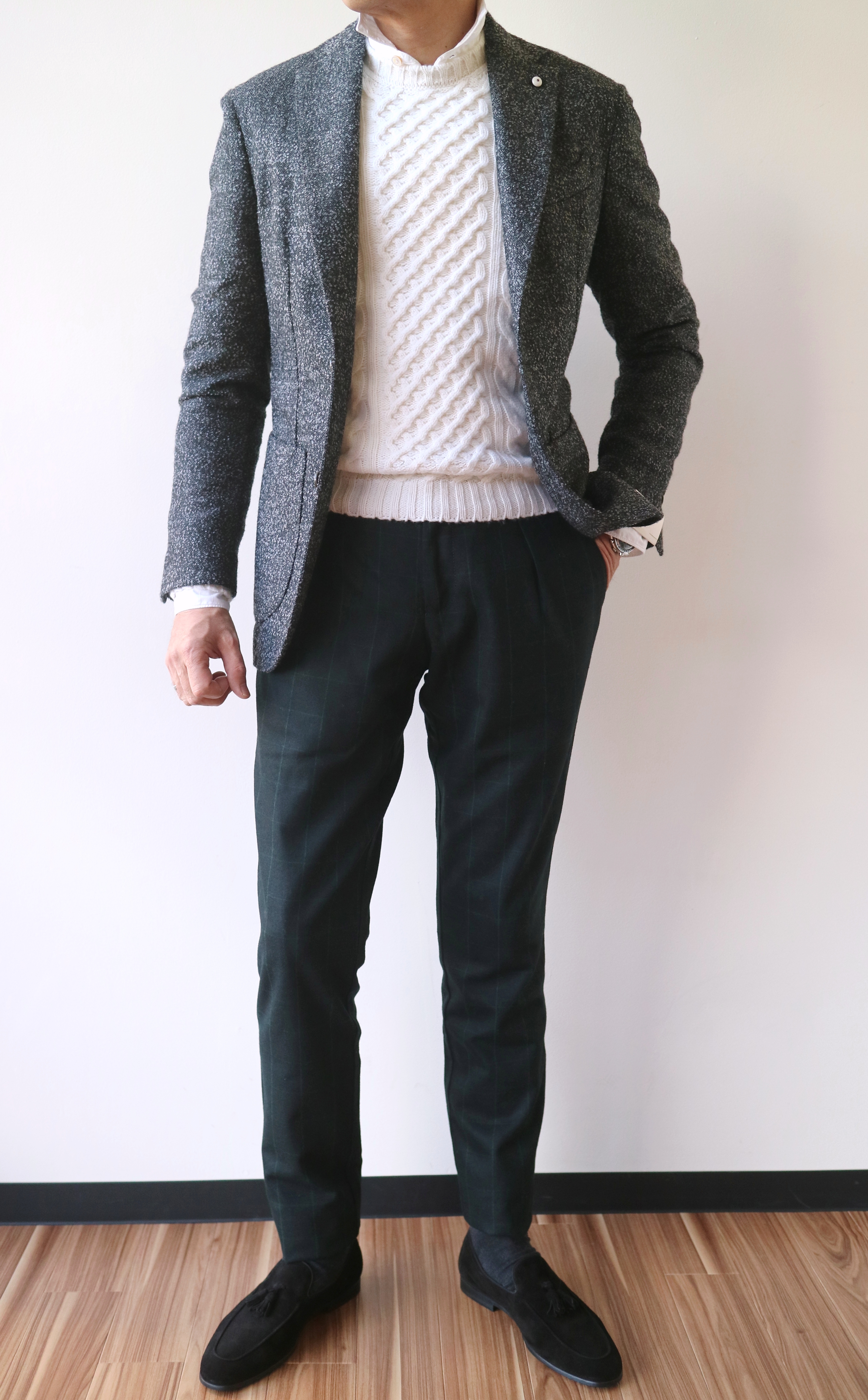 こちらのコーディネートもタカイです。今季、彼が購入した、お気に入りのBERWICH/ベルウィッチ。少し緩めで合わせてみました。