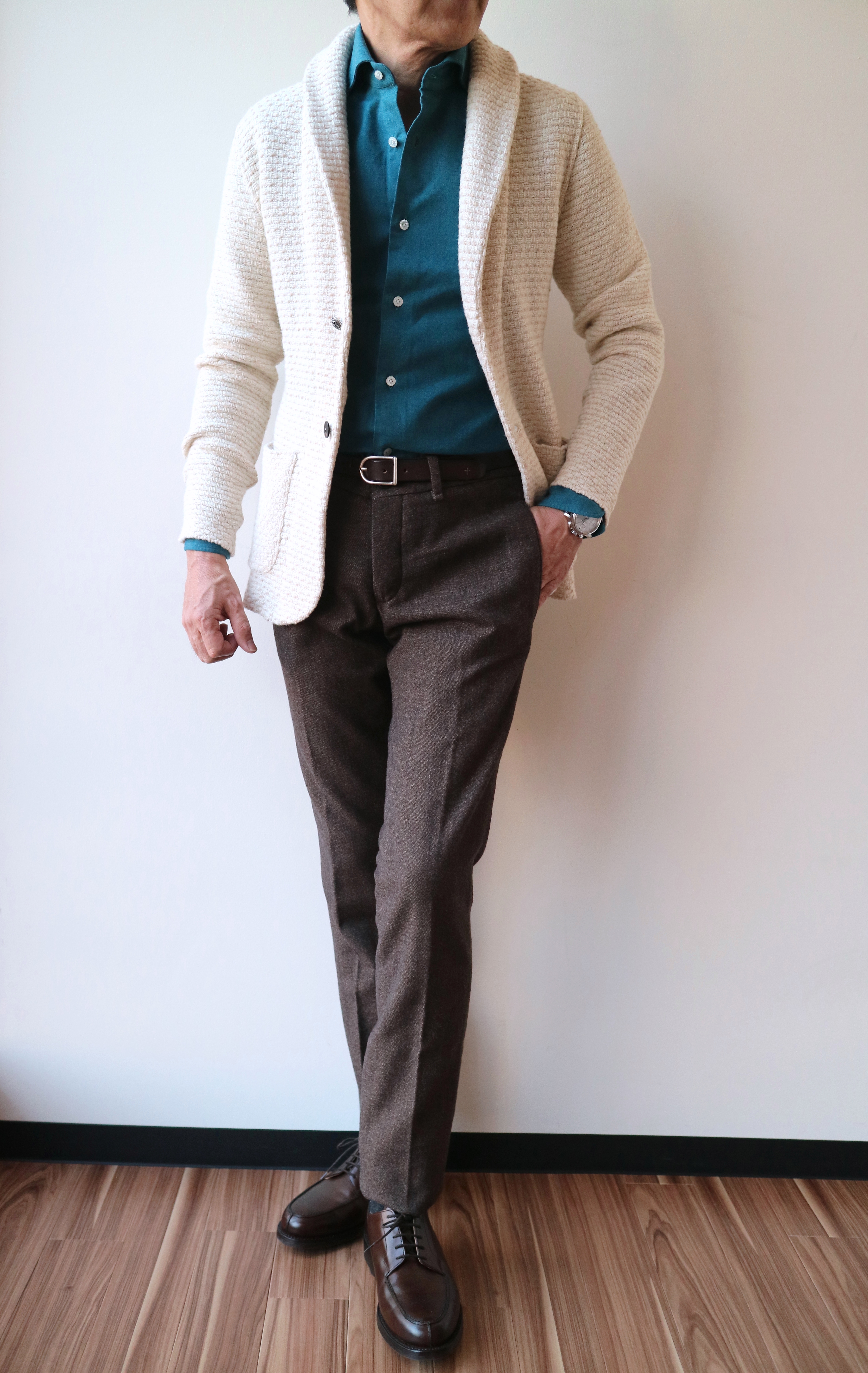 LARDINI(ラルディーニ)のニットジャケットとパンツに合わせてみました。凹凸感のあるニットジャケットとの相性は抜群。エクルの色を引き立ててくれるシアンブルーです。